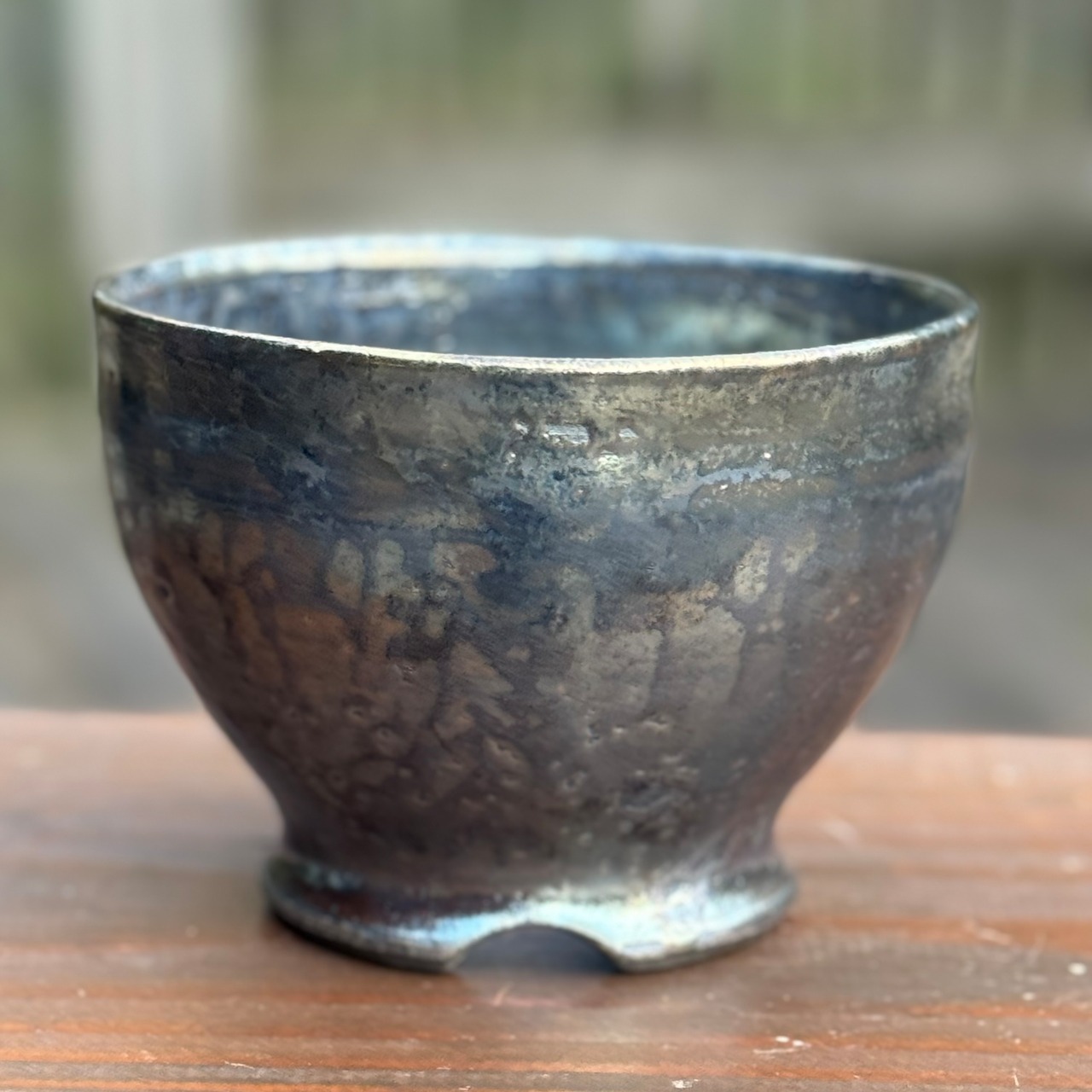 器肌全体に施された渋い光沢は、仕上げの薪による強還元焼成で得られるラスター系の金属光沢です。窯の中の置く位置で微妙に黒銀、黒金光沢などの発色が異なる特徴があります。