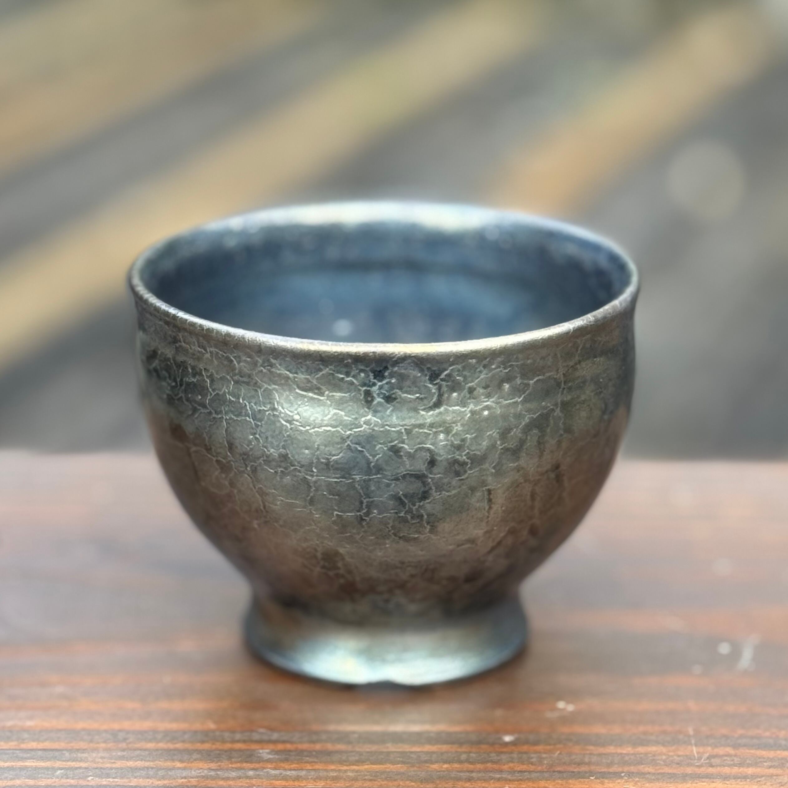 器肌全体に施された渋い光沢は、仕上げの薪による強還元焼成で得られるラスター系の金属光沢です。窯の中の置く位置で微妙に黒銀、黒金光沢などの発色が異なる特徴があります。