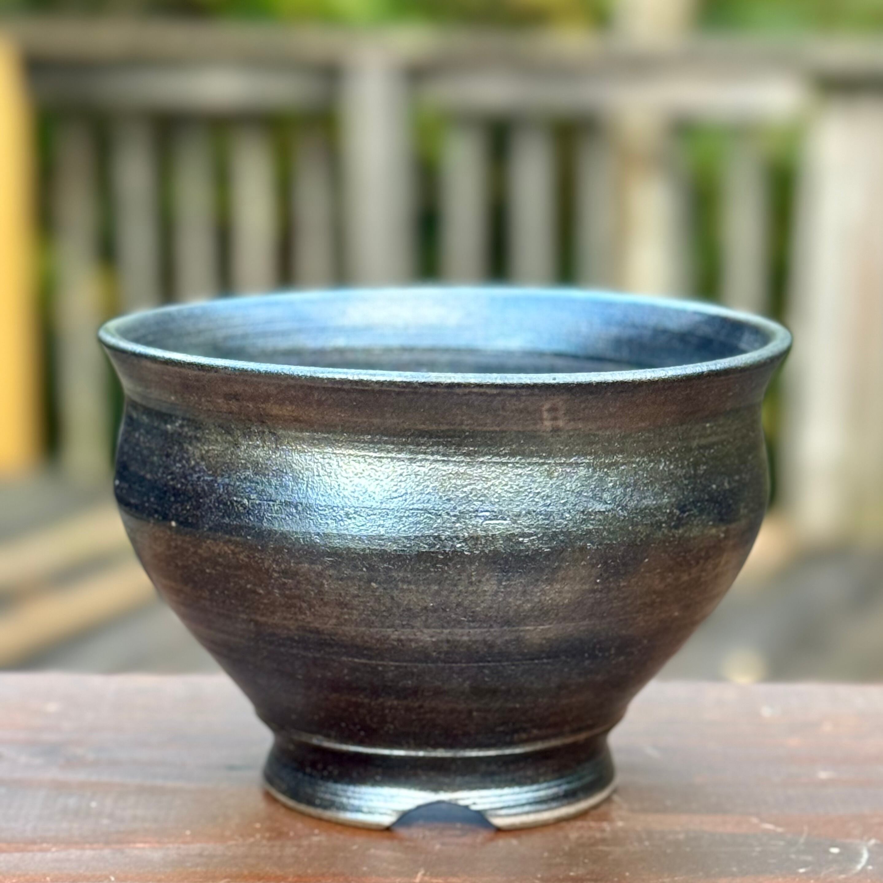 器肌全体に施された渋い光沢は、仕上げの薪による強還元焼成で得られるラスター系の金属光沢です。窯の中の置く位置で微妙に黒銀、黒金光沢がグラデーションする発色に違いがあります。