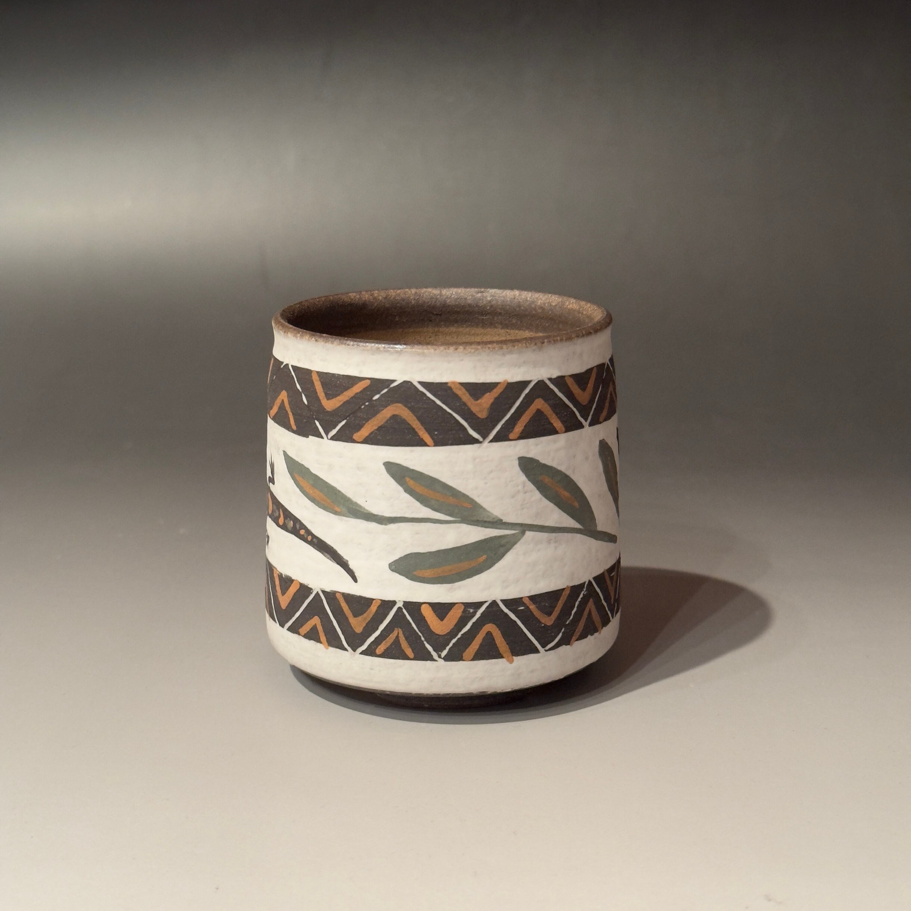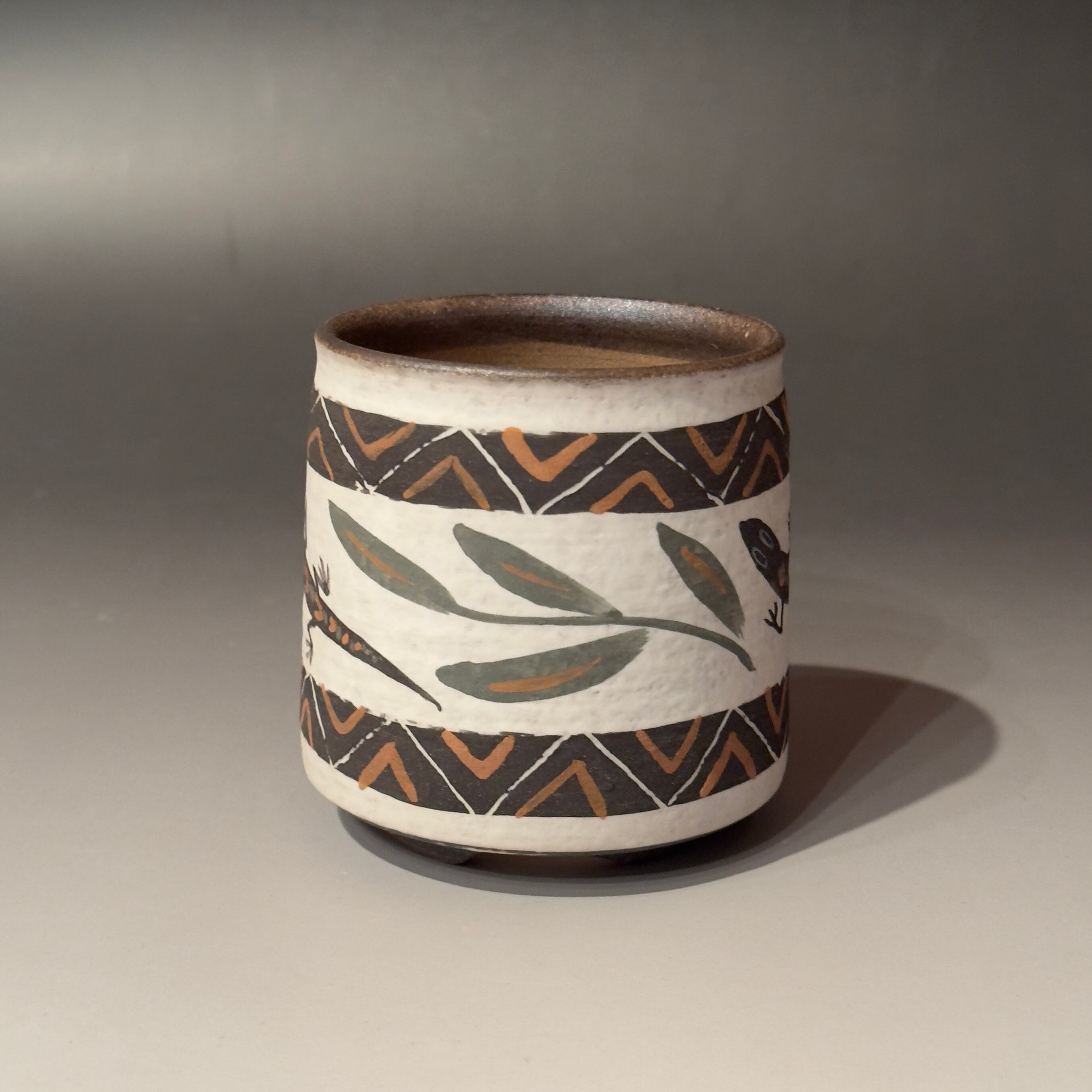 color slipによる彩色は、薪による炭彩が加わり派手でありながら渋い発色の仕上がりとなっています。古代の遺跡から発掘された彩色土器の様な風合いを帯びるよう志向して彩色したものです。