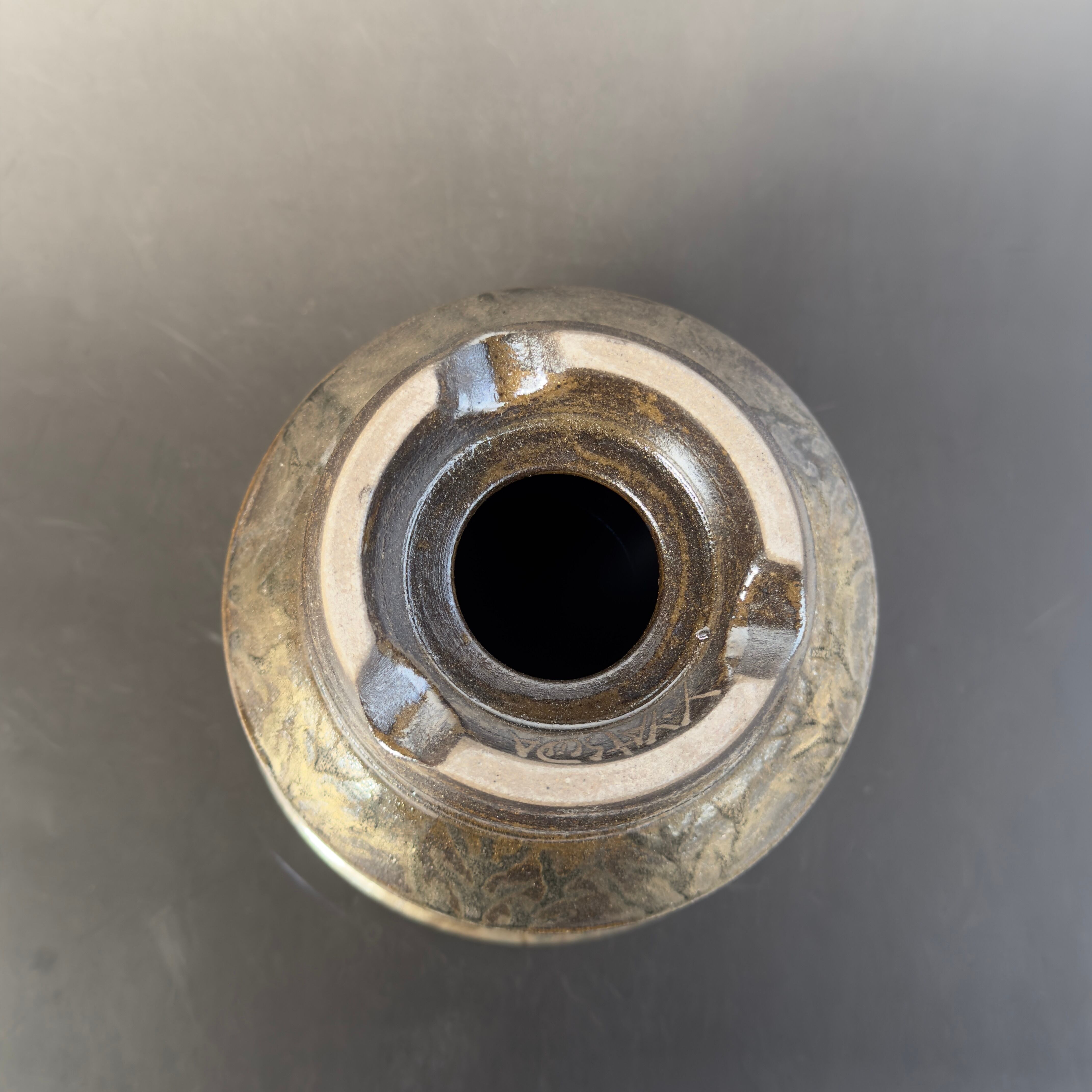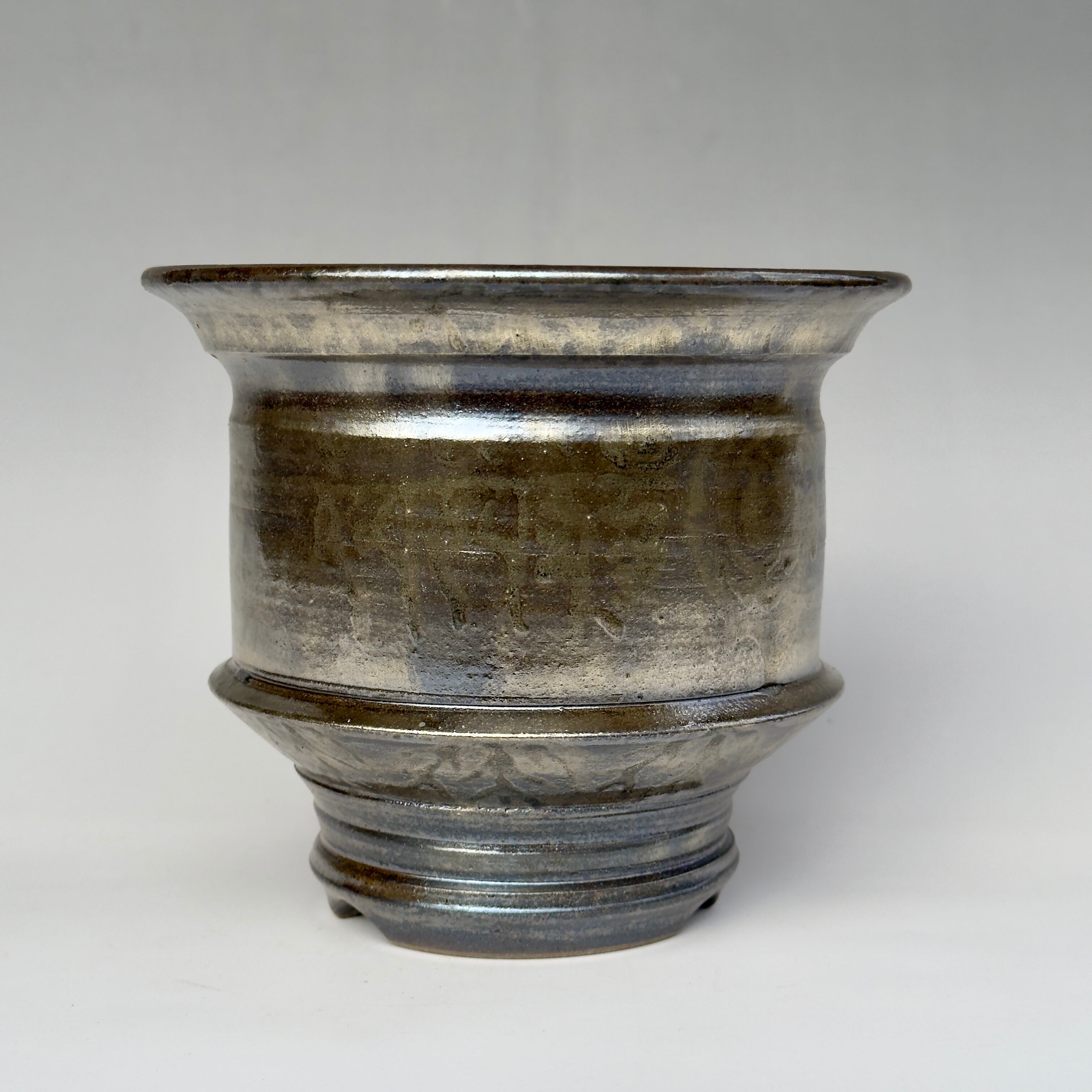 器肌全体に施された渋い光沢は、仕上げの薪による強還元焼成で得られるラスター系の金属光沢です。窯の中の置く位置で微妙に黒銀、黒金光沢などの発色が異なる特徴があります。