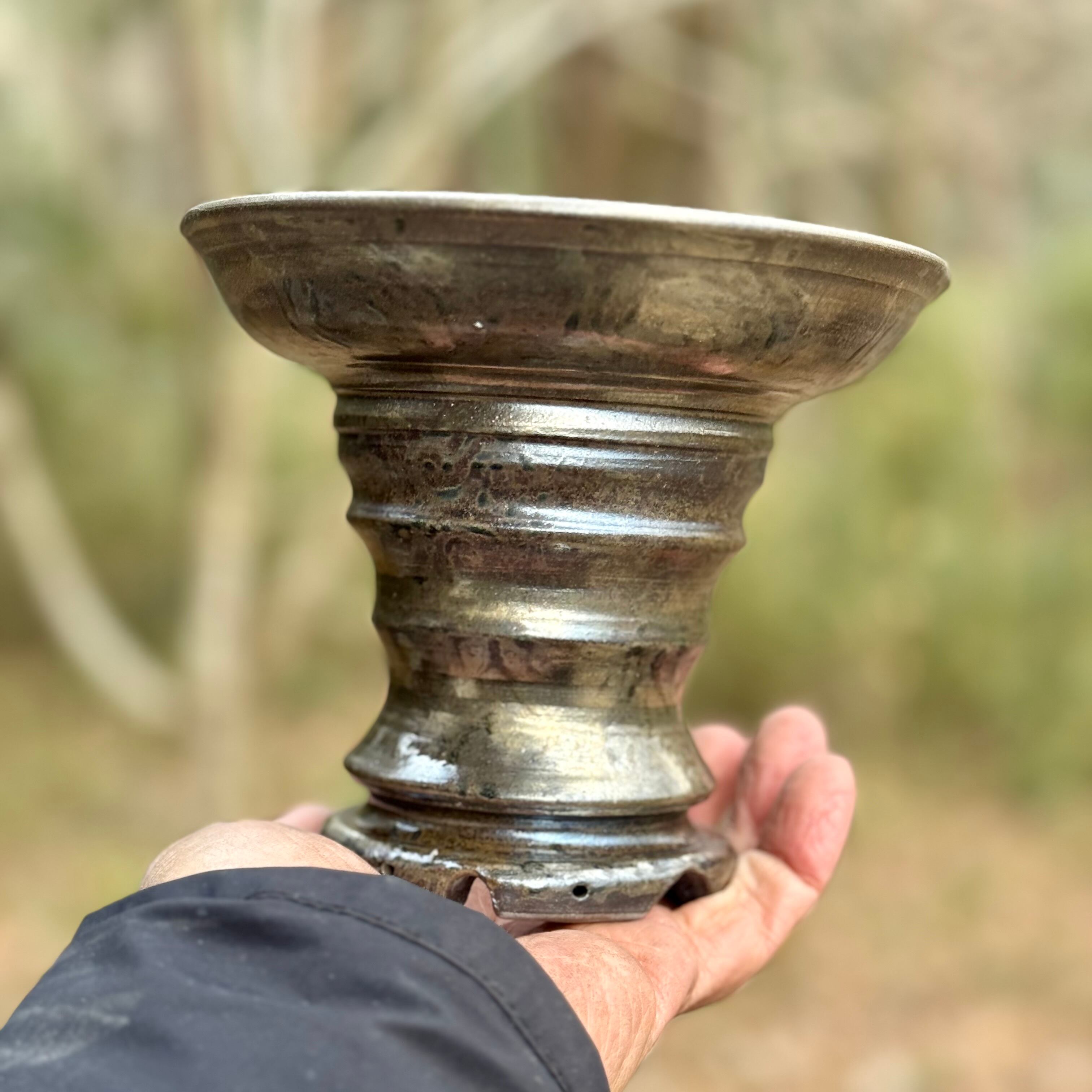 器肌全体に施された渋い光沢は、仕上げの薪による強還元焼成で得られるラスター系の金属光沢です。窯の中の置く位置で微妙に黒銀、黒金光沢がグラデーションしながら発色する位置が変化する特徴があります。