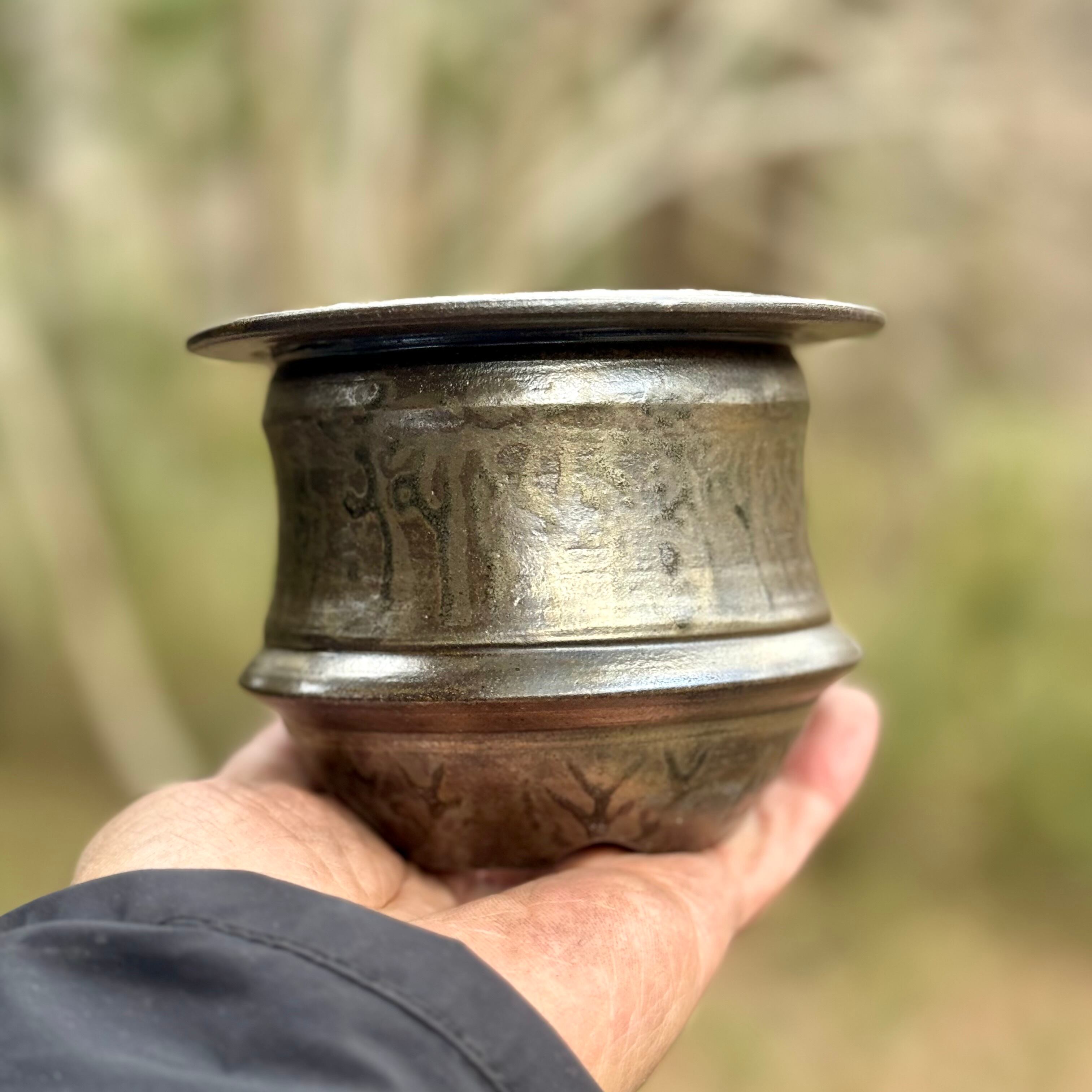 器肌全体に施された渋い光沢は、仕上げの薪による強還元焼成で得られるラスター系の金属光沢です。窯の中の置く位置で微妙に黒銀、黒金光沢がグラデーションしながら発色する位置が変化する特徴があります。