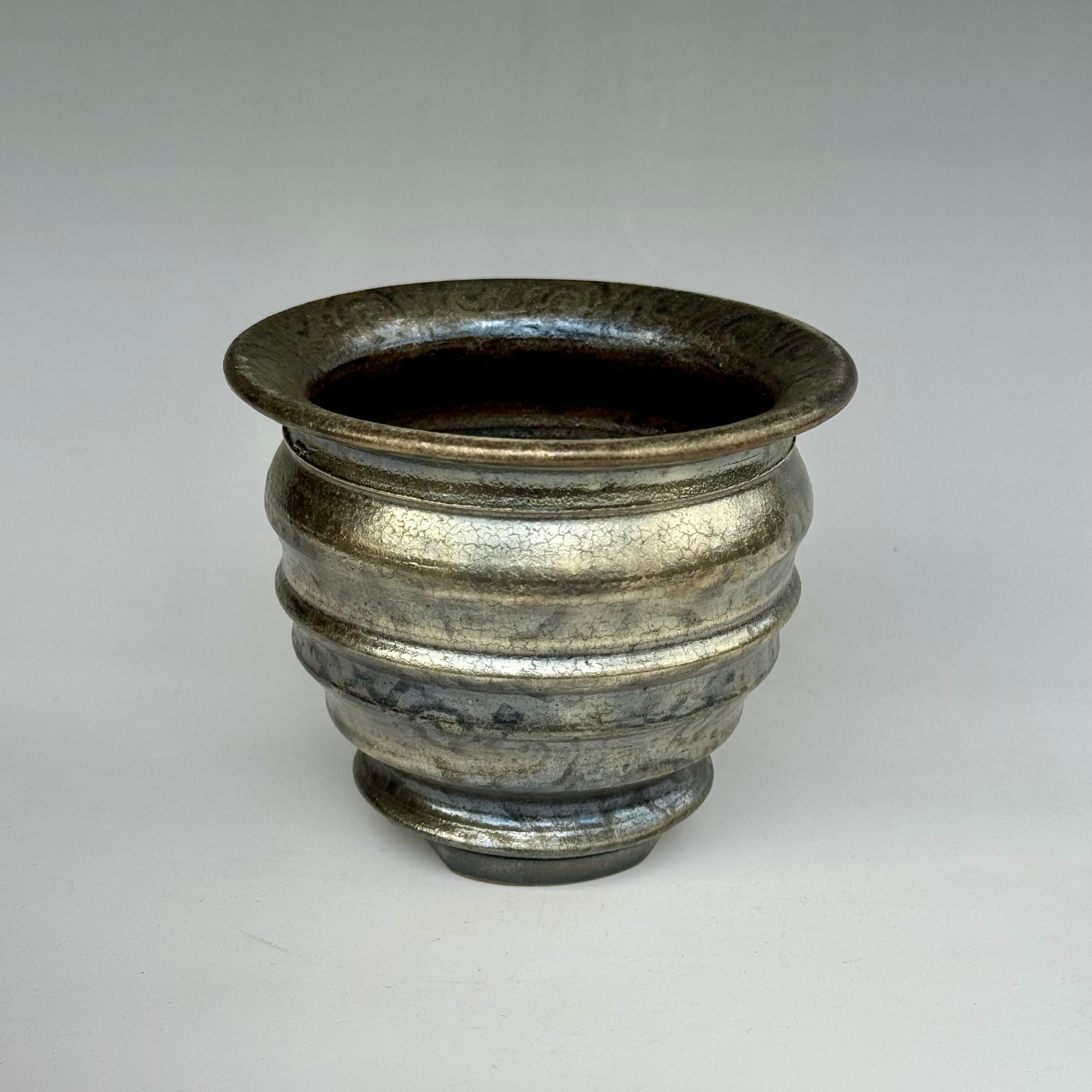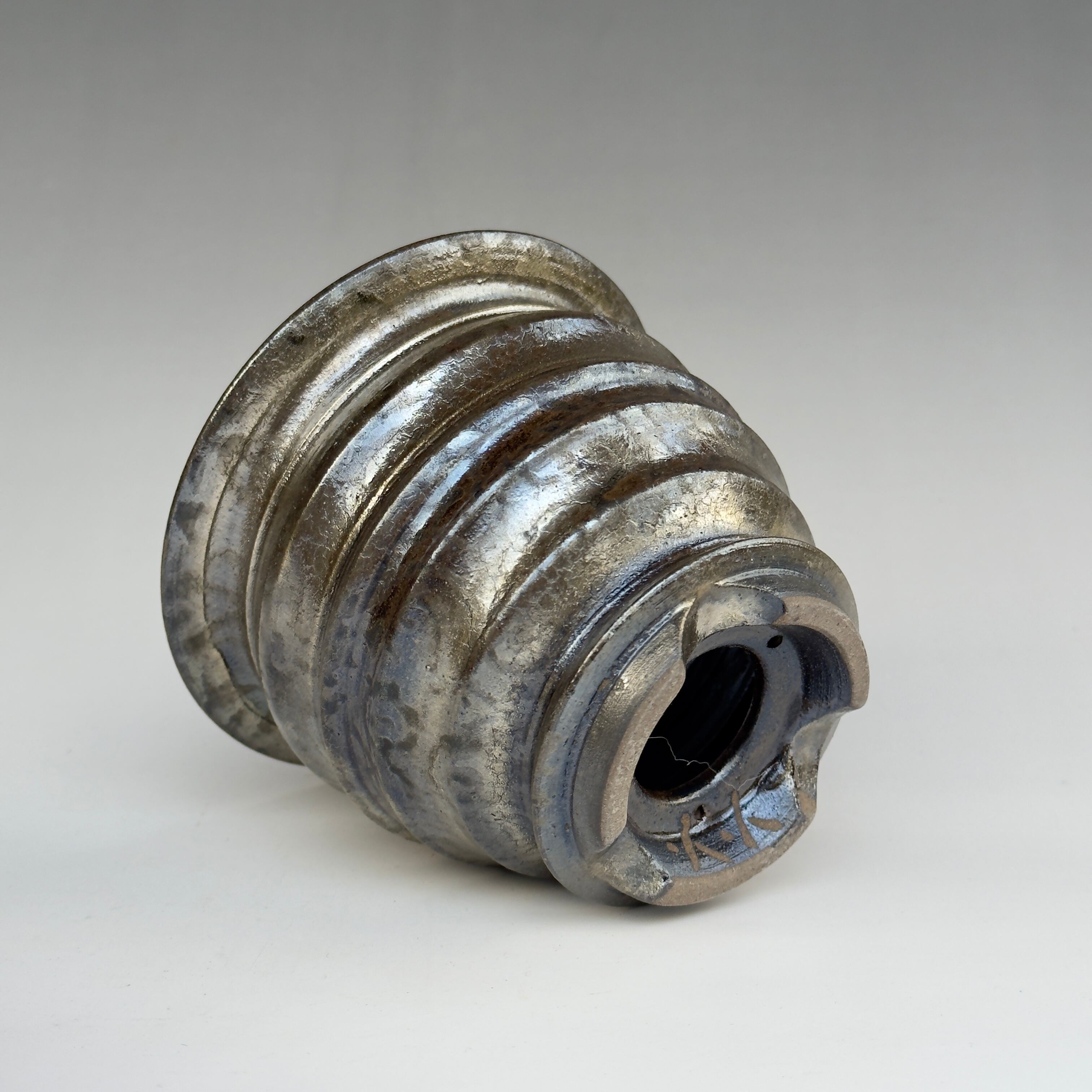 器肌全体に施された渋い光沢は、仕上げの薪による強還元焼成で得られるラスター系の金属光沢です。窯の中の置く位置で微妙に黒銀、黒金光沢がグラデーションしながら発色する位置が変化する特徴があります。