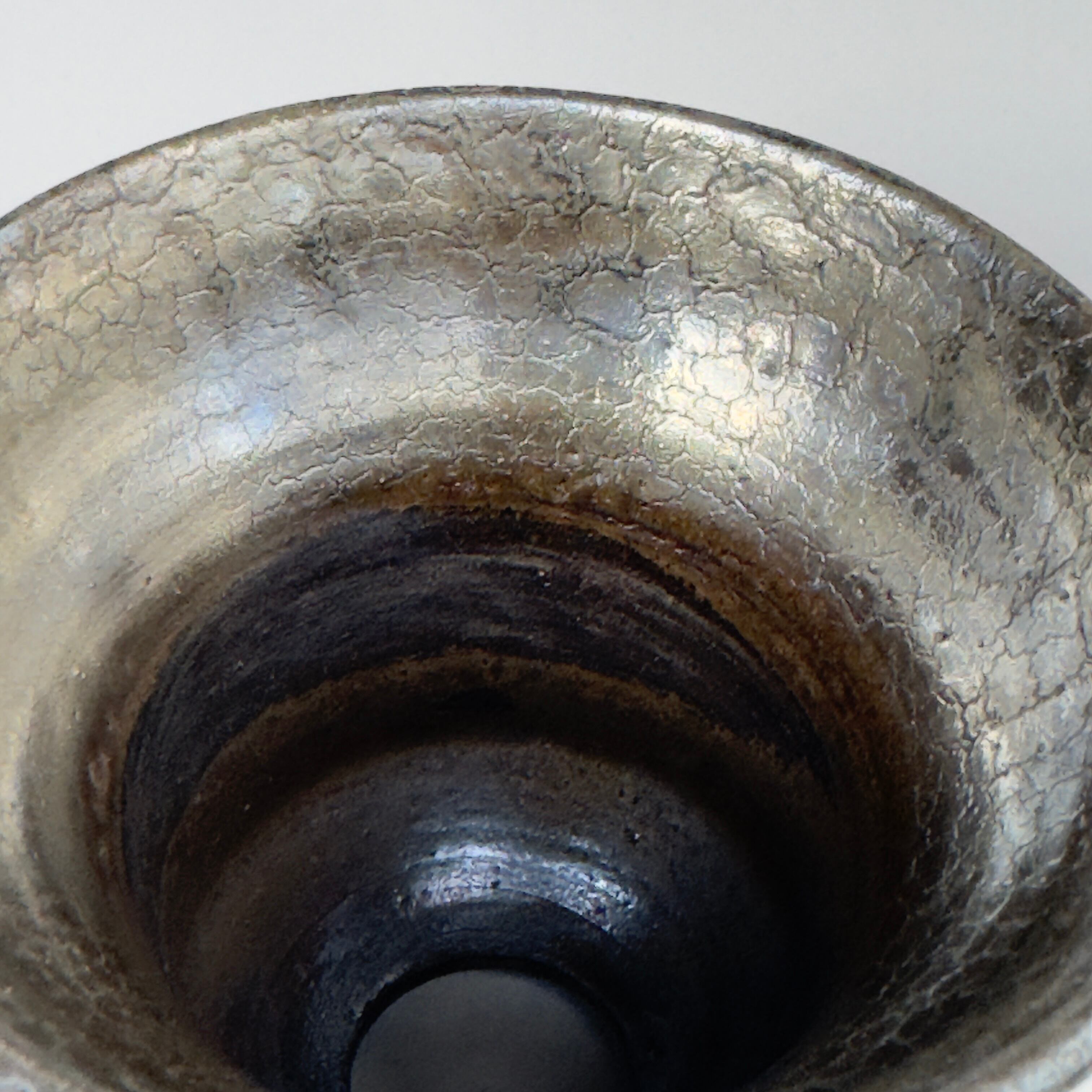器肌全体に施された渋い光沢は、仕上げの薪による強還元焼成で得られるラスター系の金属光沢です。窯の中の置く位置で微妙に黒銀、黒金光沢がグラデーションしながら発色する位置が変化する特徴があります。
