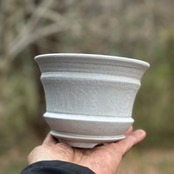 半磁器土で作陶した白い植木鉢です。焼き色は、単調な白色ではなくwhite slipを使い、複雑で深みのある白色に発色しています。白色の濃淡で文様をいれています。