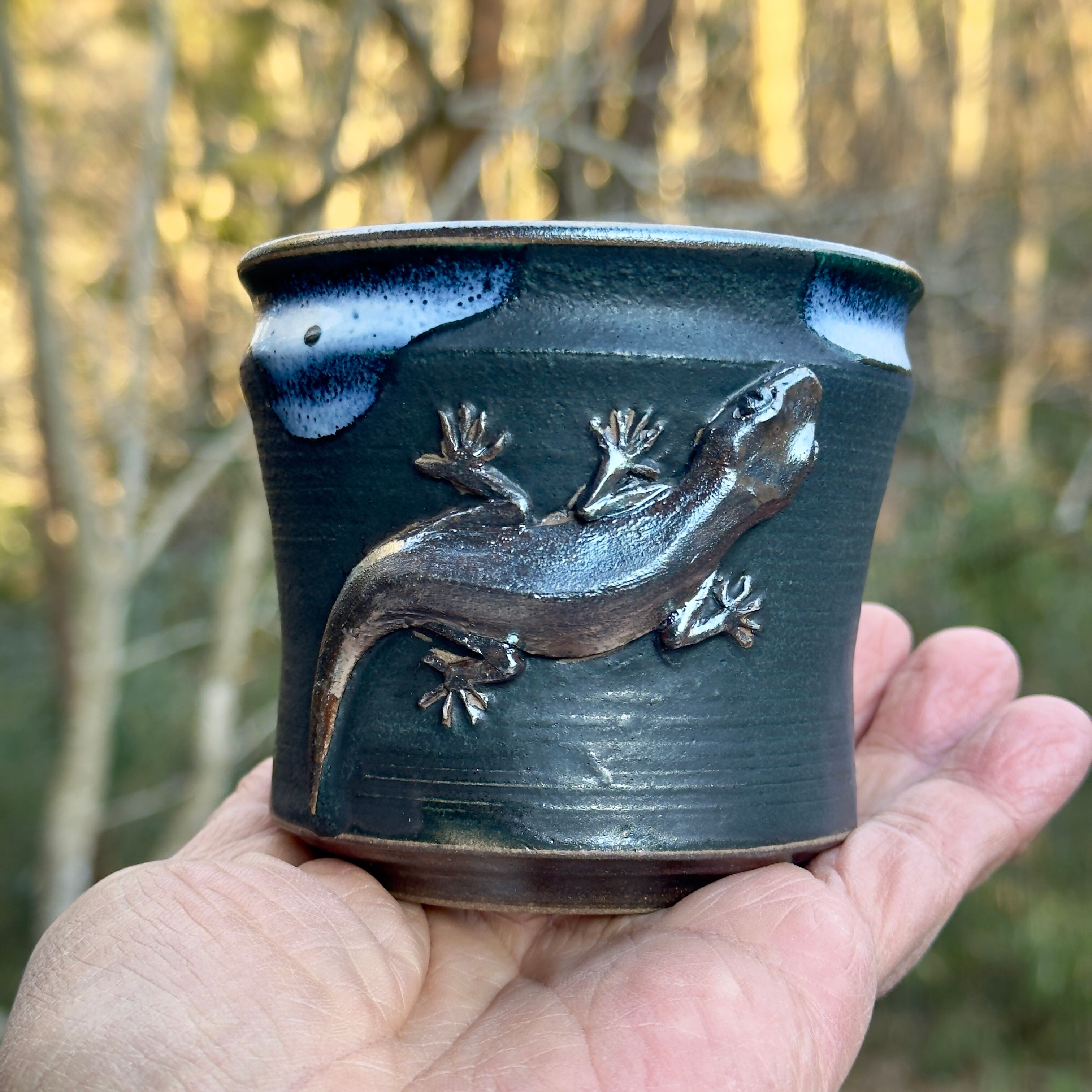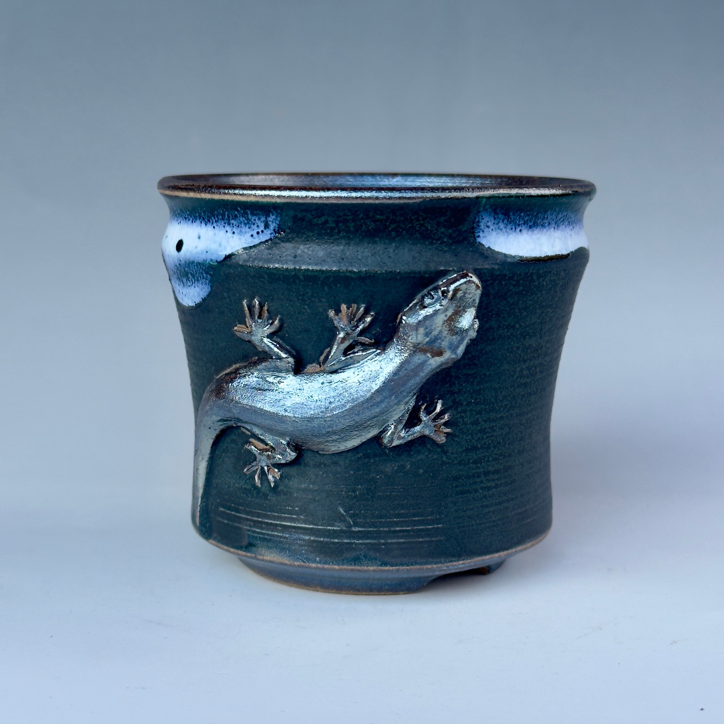 植木鉢の縁とヤモリは、薪による強還元で金属光沢を放っています。