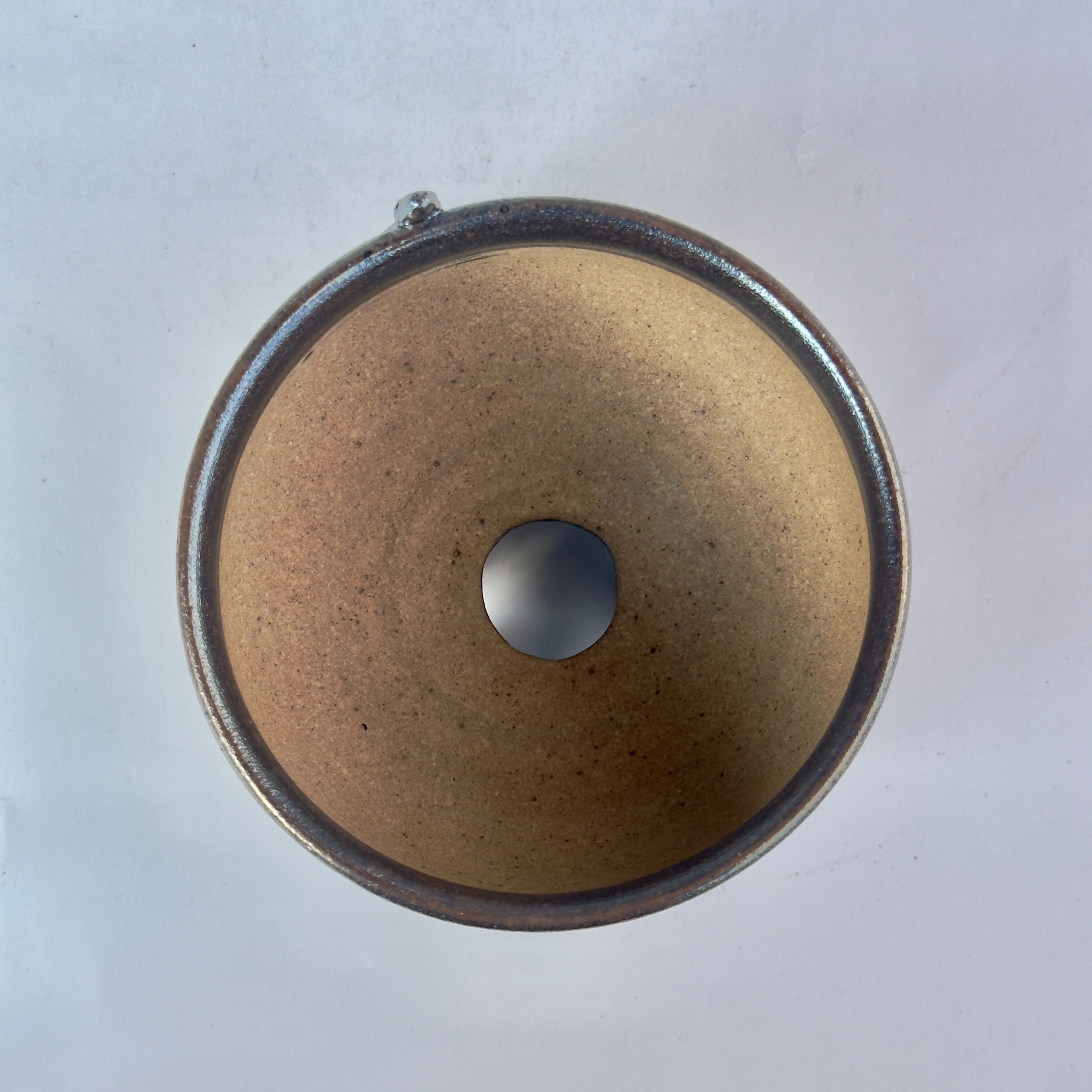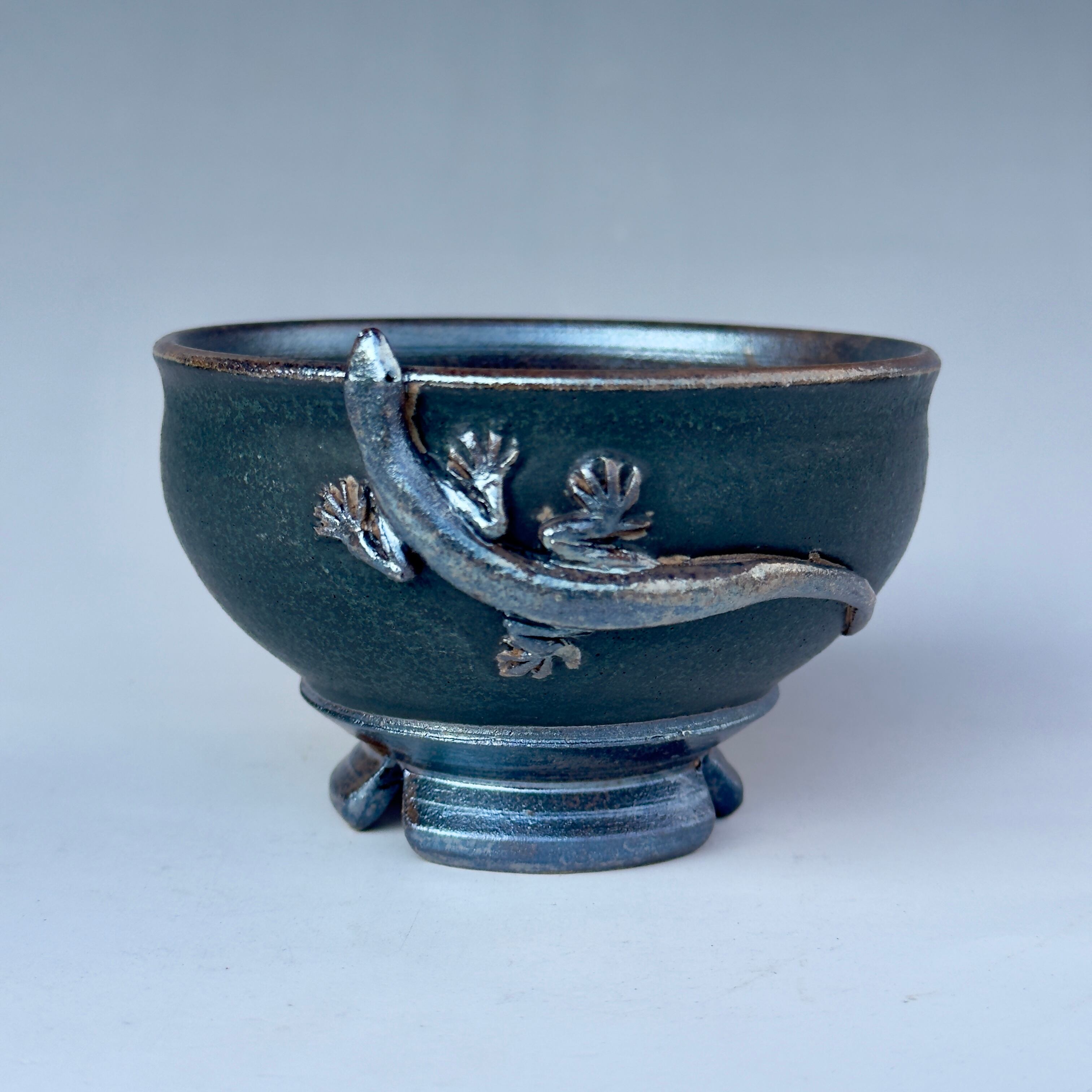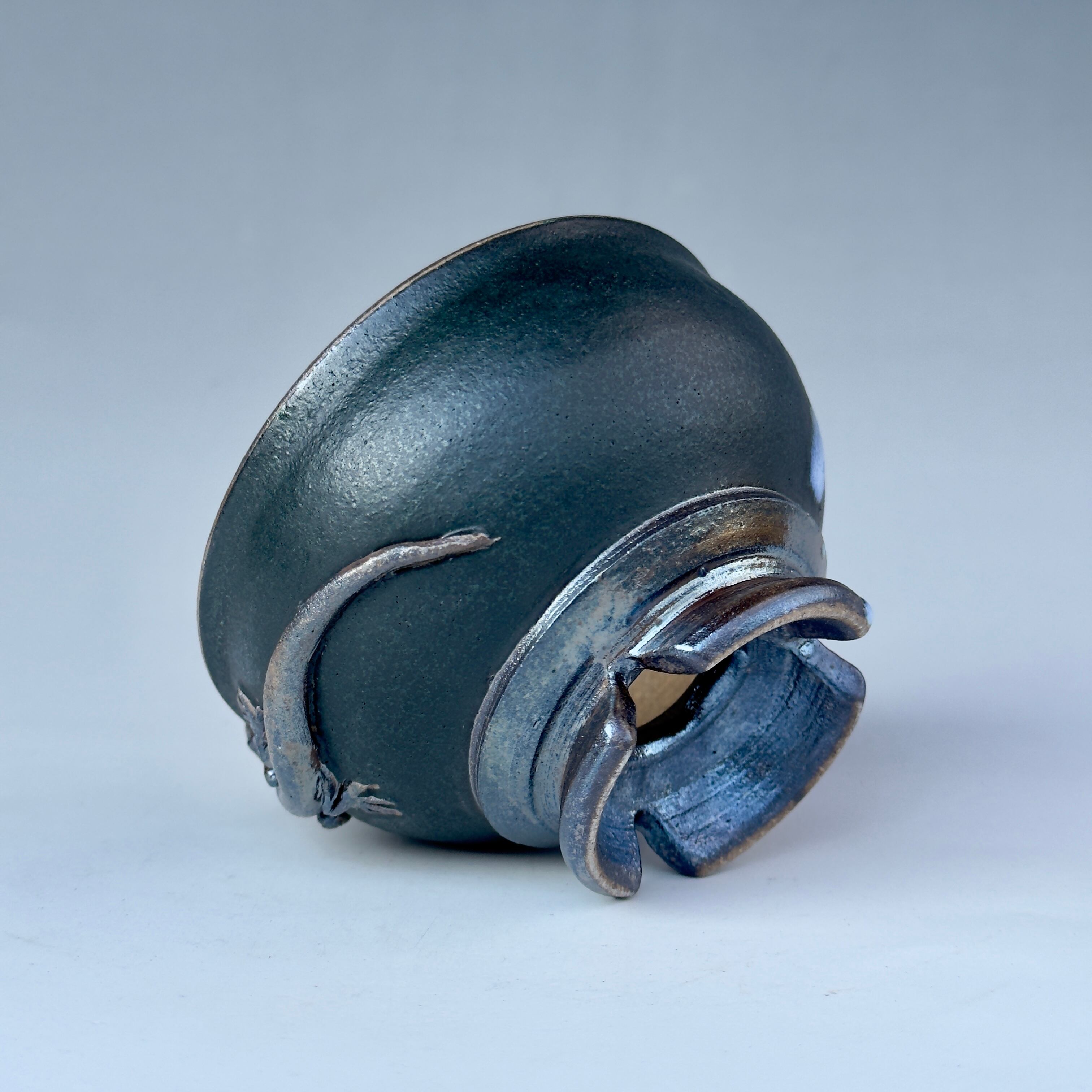 植木鉢の縁とヤモリは、薪による強還元で金属光沢を放っています。
