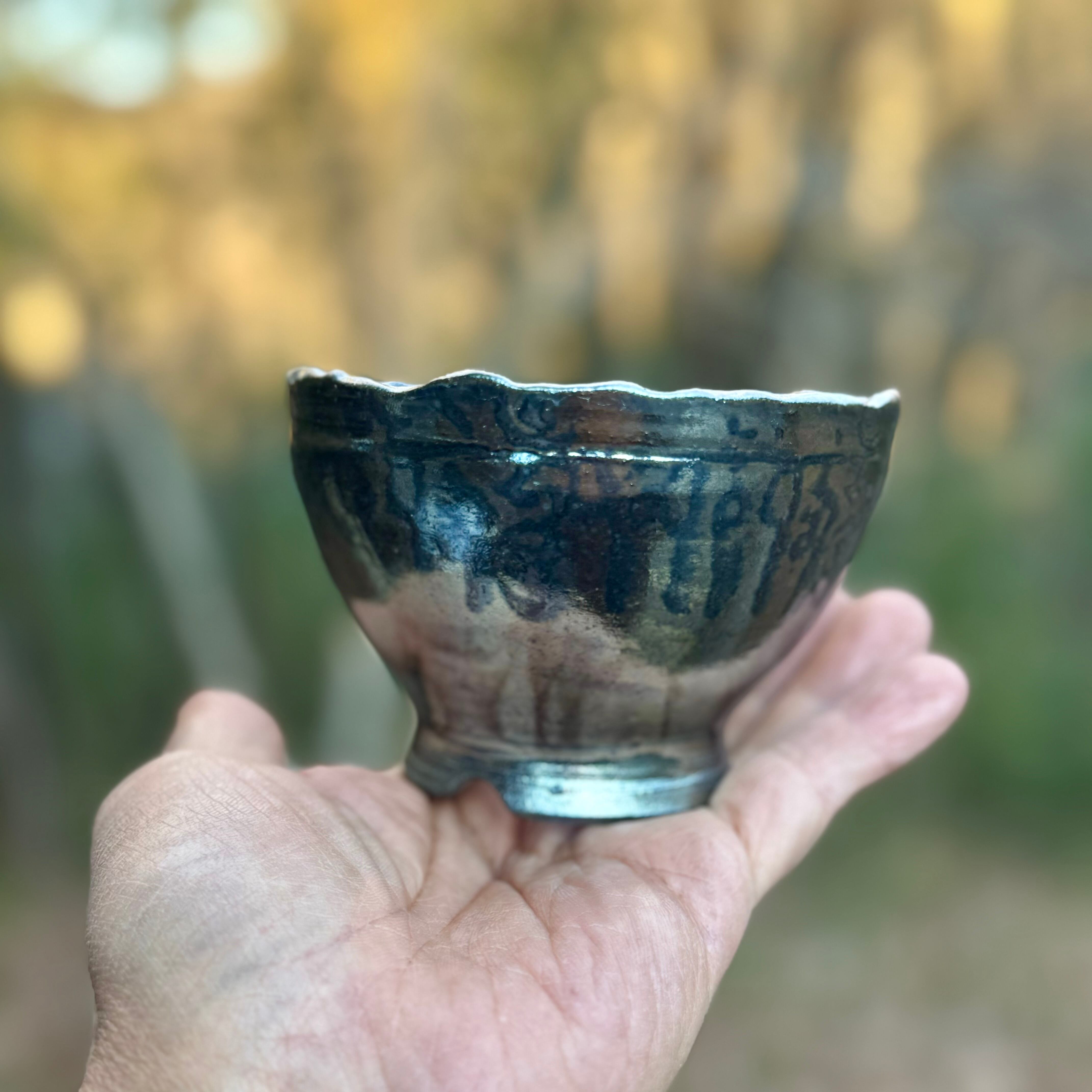 器肌全体に施された渋い光沢は、仕上げの薪による強還元焼成で得られるラスター系の金属光沢です。窯の中の置く位置で微妙に黒銀、黒金光沢などの発色が異なる特徴があります。