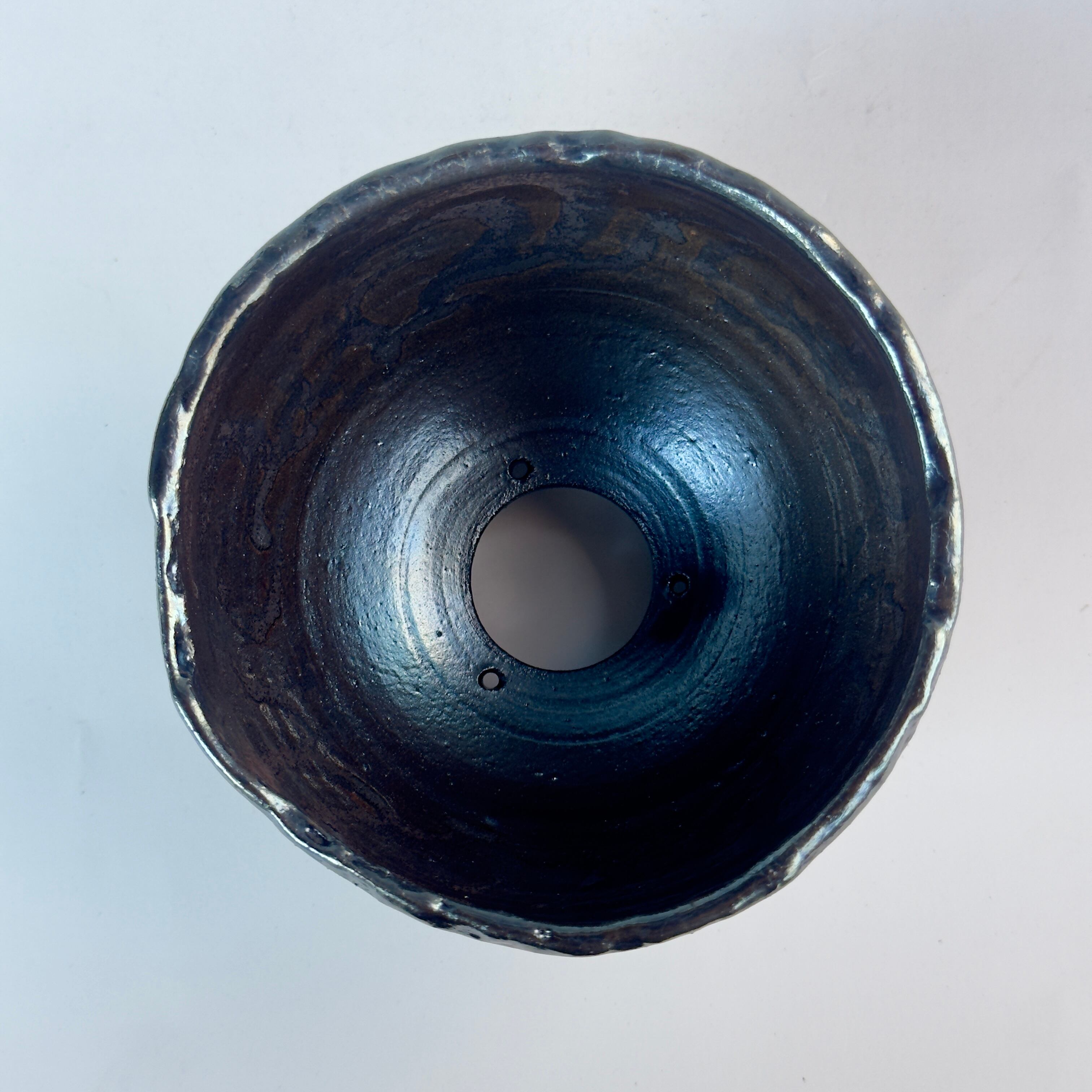 鉢の底穴は大きく開け、通気兼枝振り整えるためのワイヤー通しの小穴を開けています。