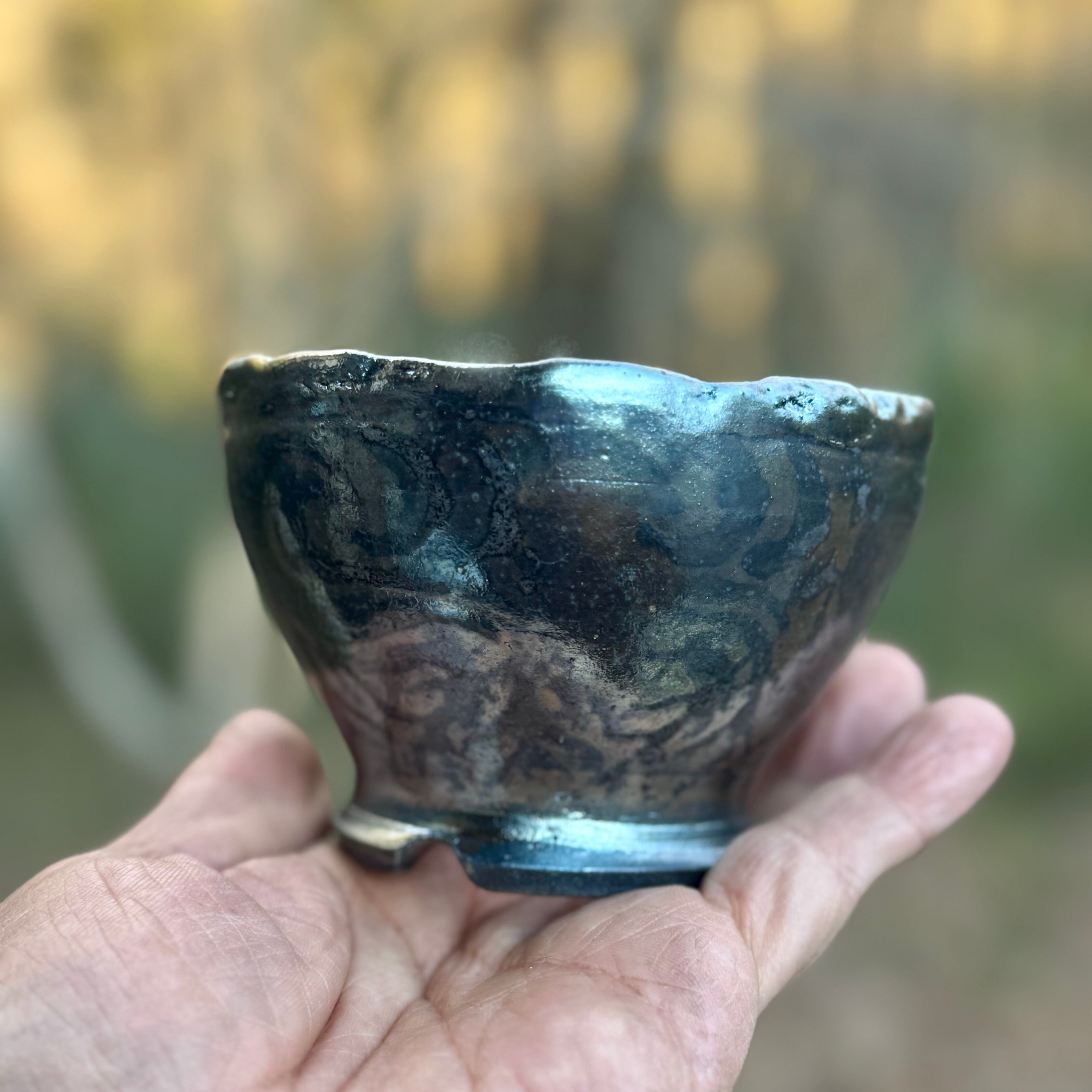器肌全体に施された渋い光沢は、仕上げの薪による強還元焼成で得られるラスター系の金属光沢です。窯の中の置く位置で微妙に黒銀、黒金光沢などの発色が異なる特徴があります。