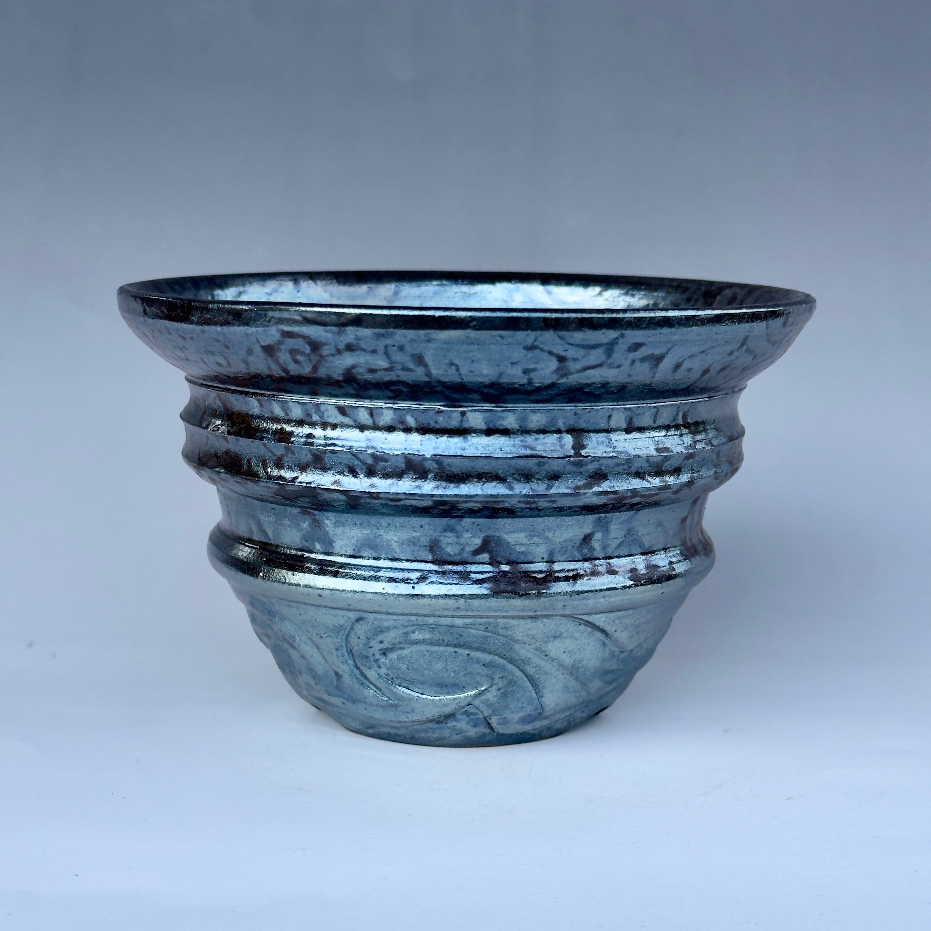 器肌全体に施された渋い光沢は、仕上げの薪による強還元焼成で得られるラスター系の金属光沢です。窯の中の置く位置で微妙に黒銀、黒金光沢がグラデーションしながら発色する位置が変化する特徴があります。