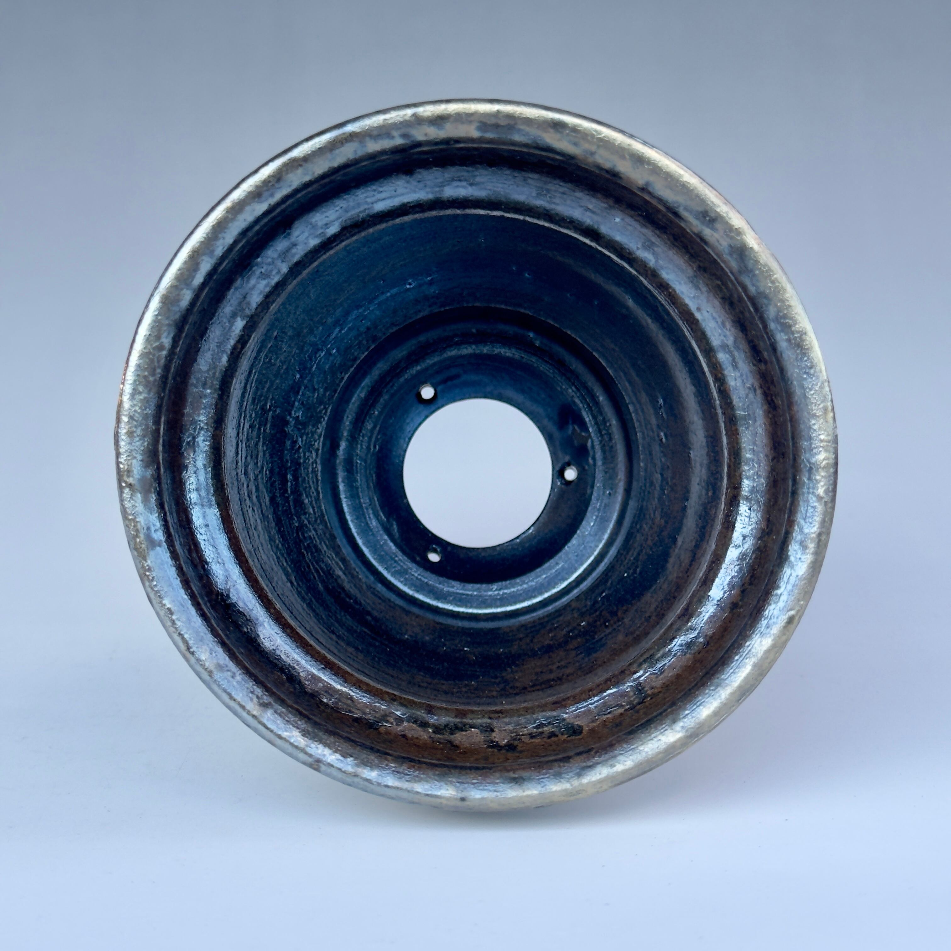 器肌全体に施された渋い光沢は、仕上げの薪による強還元焼成で得られるラスター系の金属光沢です。窯の中の置く位置で微妙に黒銀、黒金光沢がグラデーションしながら発色する位置が変化する特徴があります。