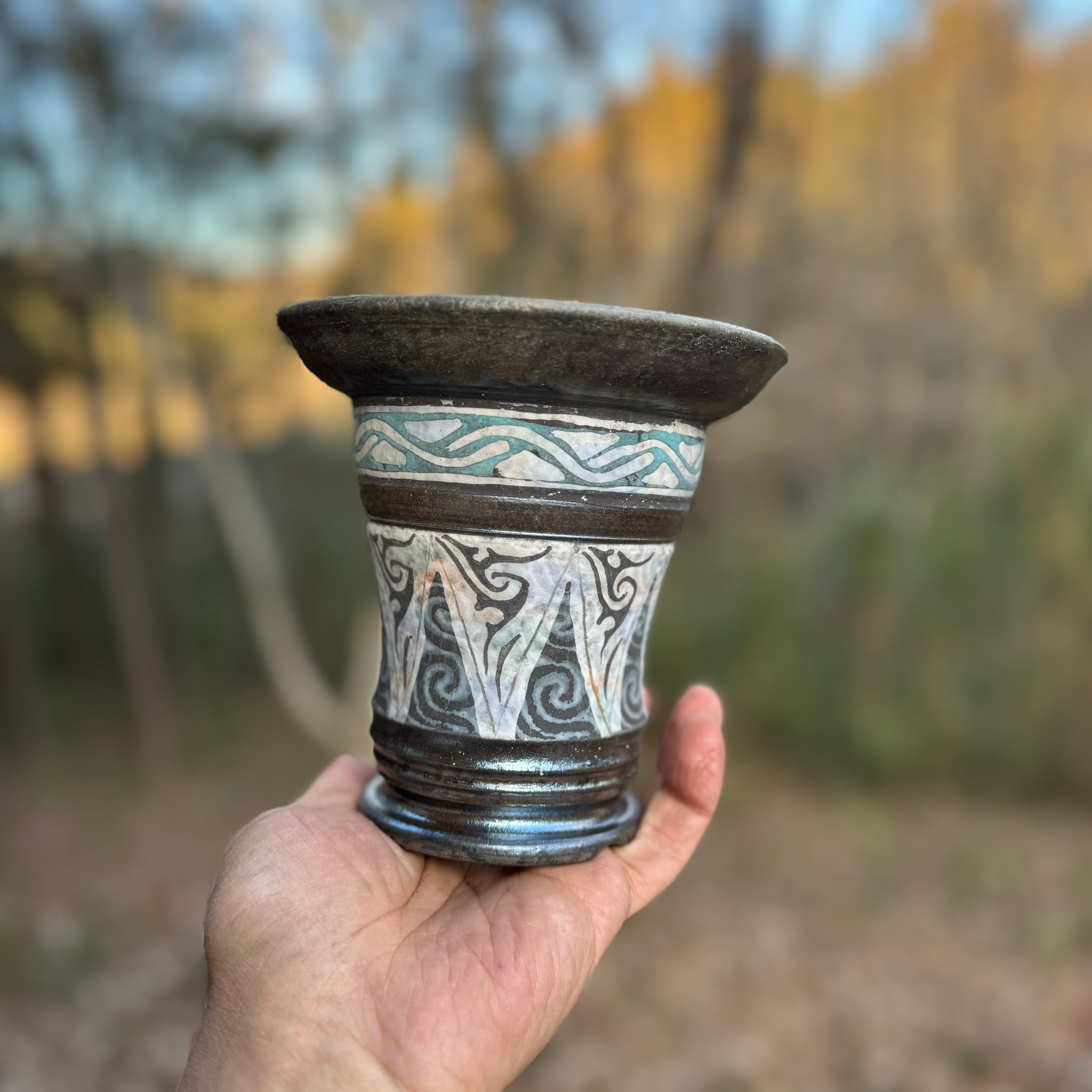 color slipによる彩色は、薪による炭彩が加わり派手でありながら渋い発色の仕上がりとなっています。古代の遺跡から発掘された彩色土器の様な風合いを帯びるよう志向して彩色したものです。