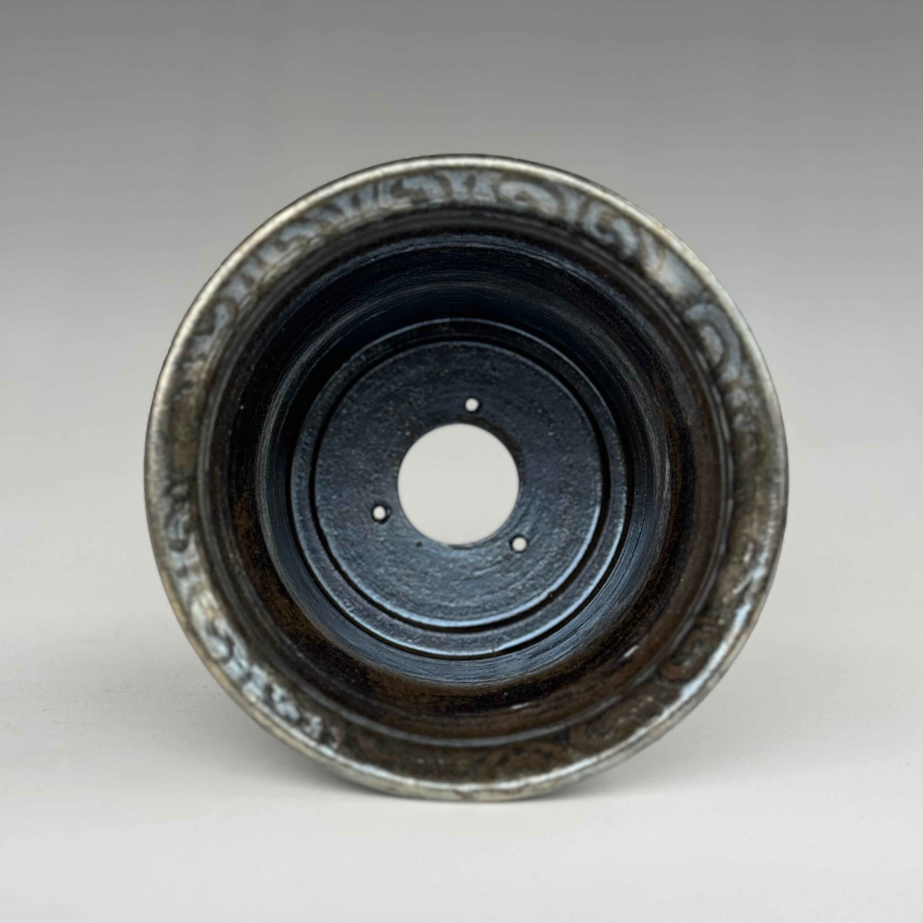 器肌全体に施された渋い光沢は、仕上げの薪による強還元焼成で得られるラスター系の金属光沢です。窯の中の置く位置で微妙に黒銀、黒金光沢などの発色が異なる特徴があります。