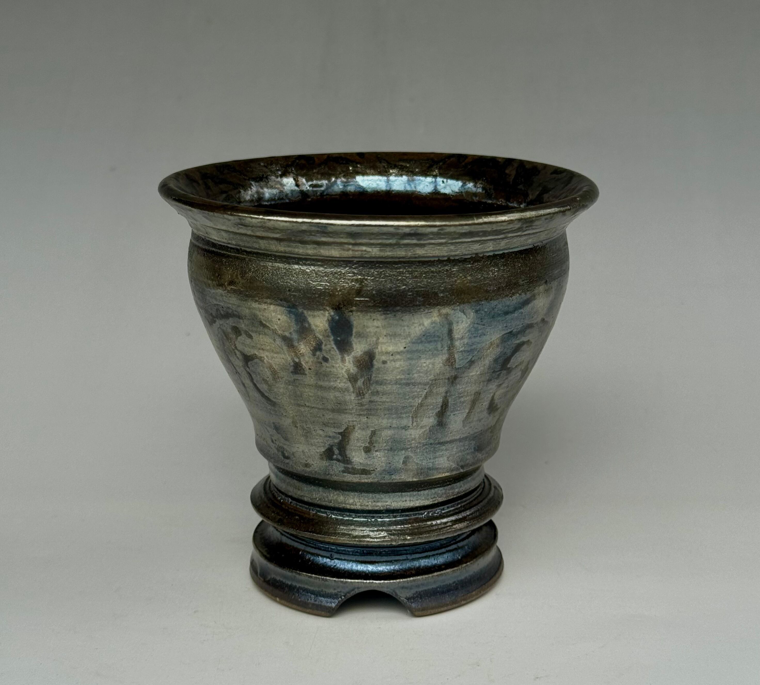 器肌全体に施された渋い光沢は、仕上げの薪による強還元焼成で得られるラスター系の金属光沢です。窯の中の置く位置で微妙に黒銀、黒金光沢などの発色が異なる特徴があります。今回の窯では黒銀から黒金へのグラデーションが綺麗にでています。