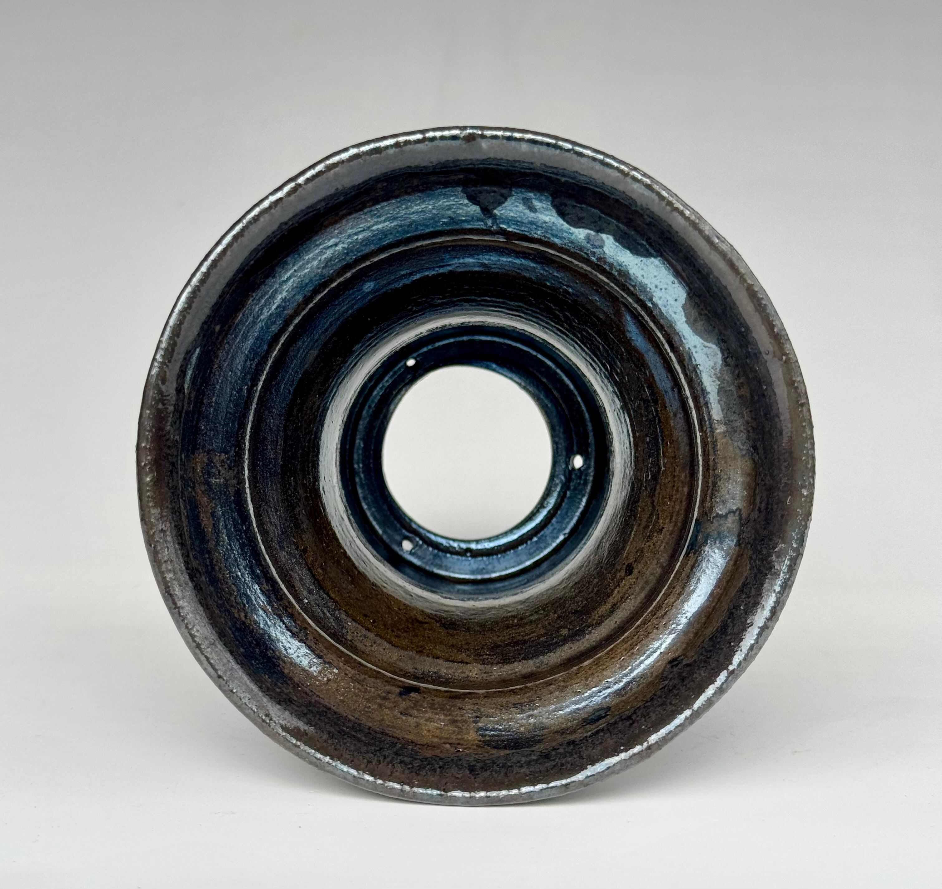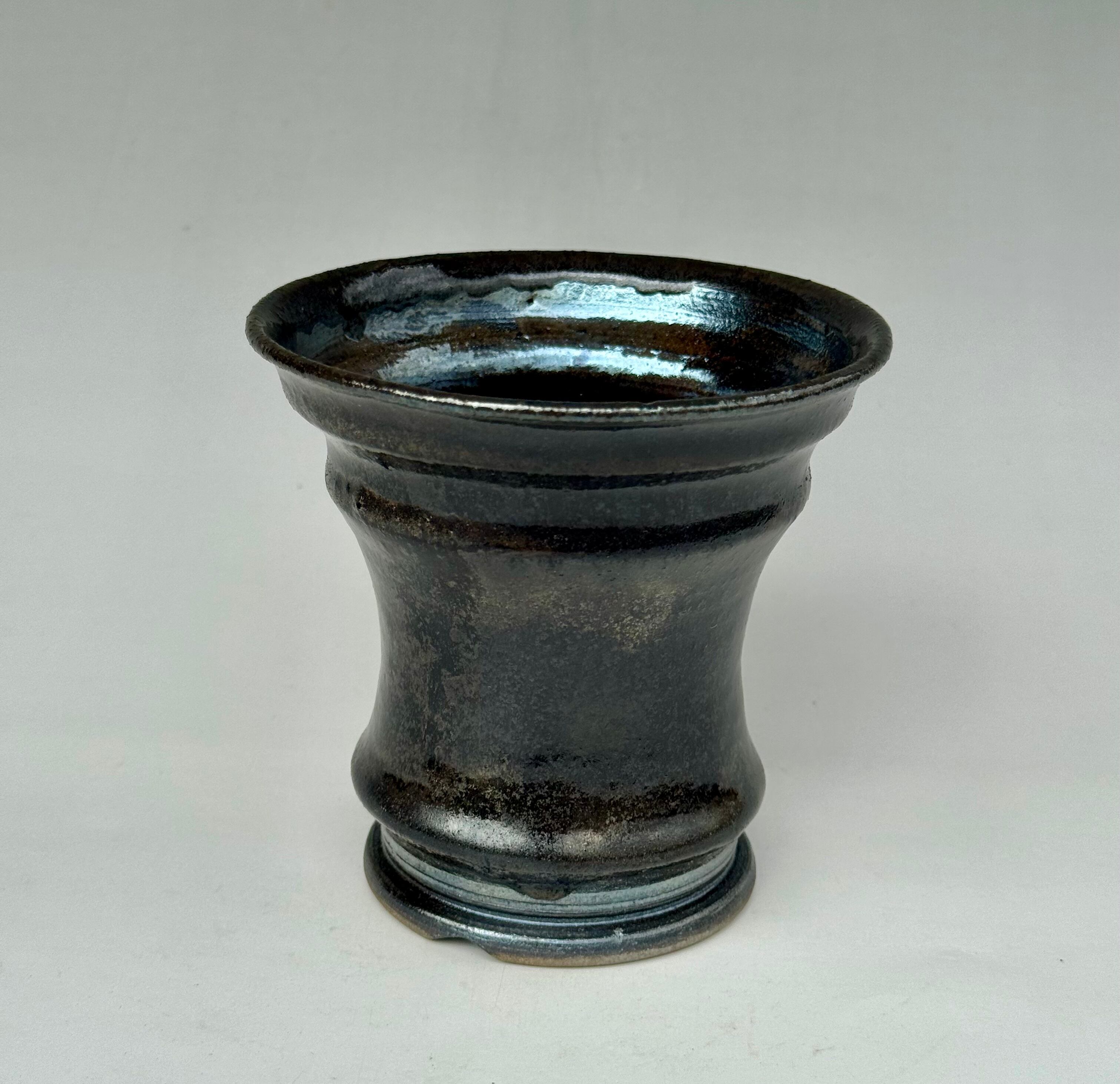 オリジナル配合の砂金釉薬(アヴェチェリン釉薬)を施しています。いわゆる金泥系の釉薬ですが、高温で焼成することにより、金属光沢にガラス質の艶が加わり耐久性のある輝きになります。時に器肌のガラス光沢の奥に渋く金色の結晶が現れて面白い風景が生じます。光にかざすと艶のある黒銀と金色が混ざり合う複雑な表情を見ることができます。