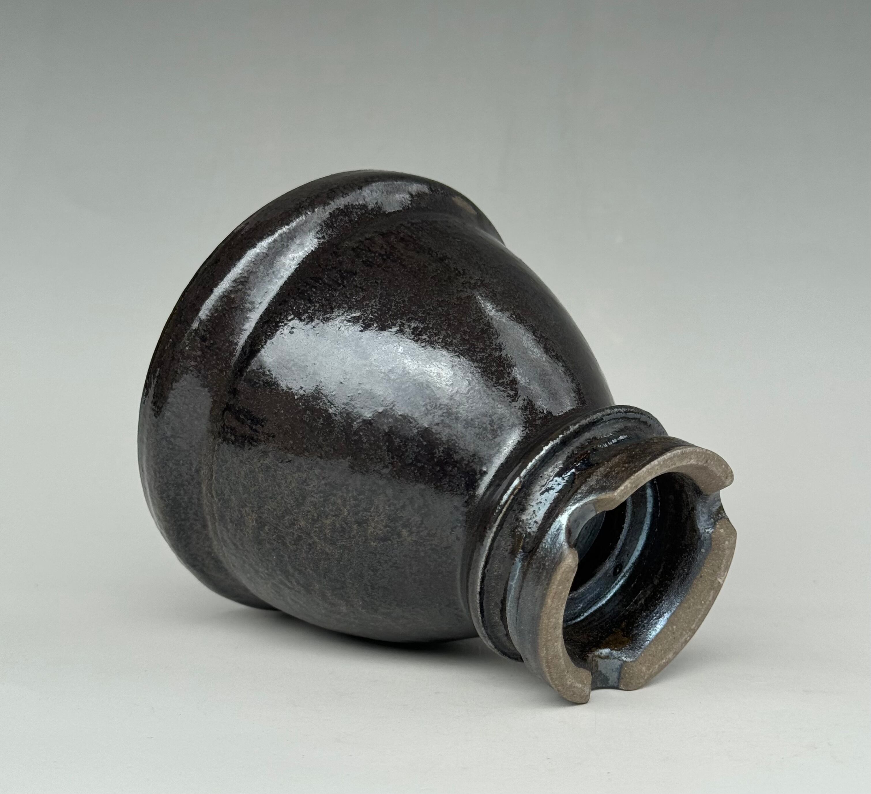 オリジナル配合の砂金釉薬(アヴェチェリン釉薬)を施しています。いわゆる金泥系の釉薬ですが、高温で焼成することにより、金属光沢にガラス質の艶が加わり耐久性のある輝きになります。時に器肌のガラス光沢の奥に渋く金色の結晶が現れて面白い風景が生じます。光にかざすと艶のある黒銀と金色が混ざり合う複雑な表情を見ることができます。