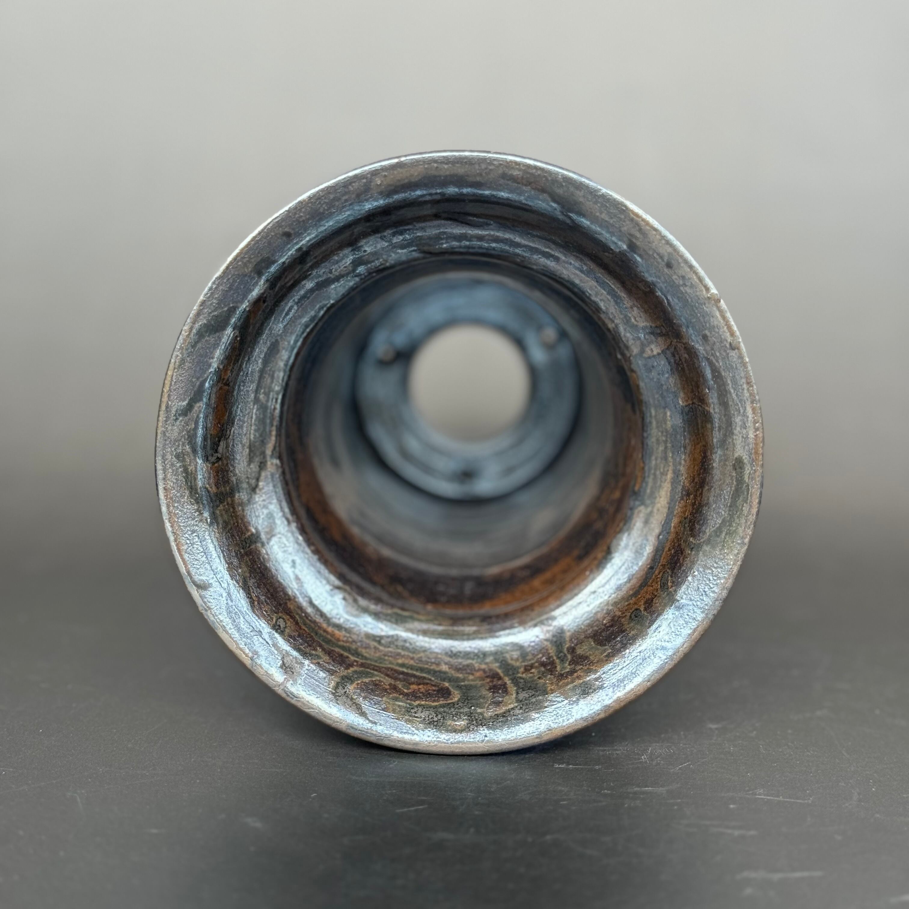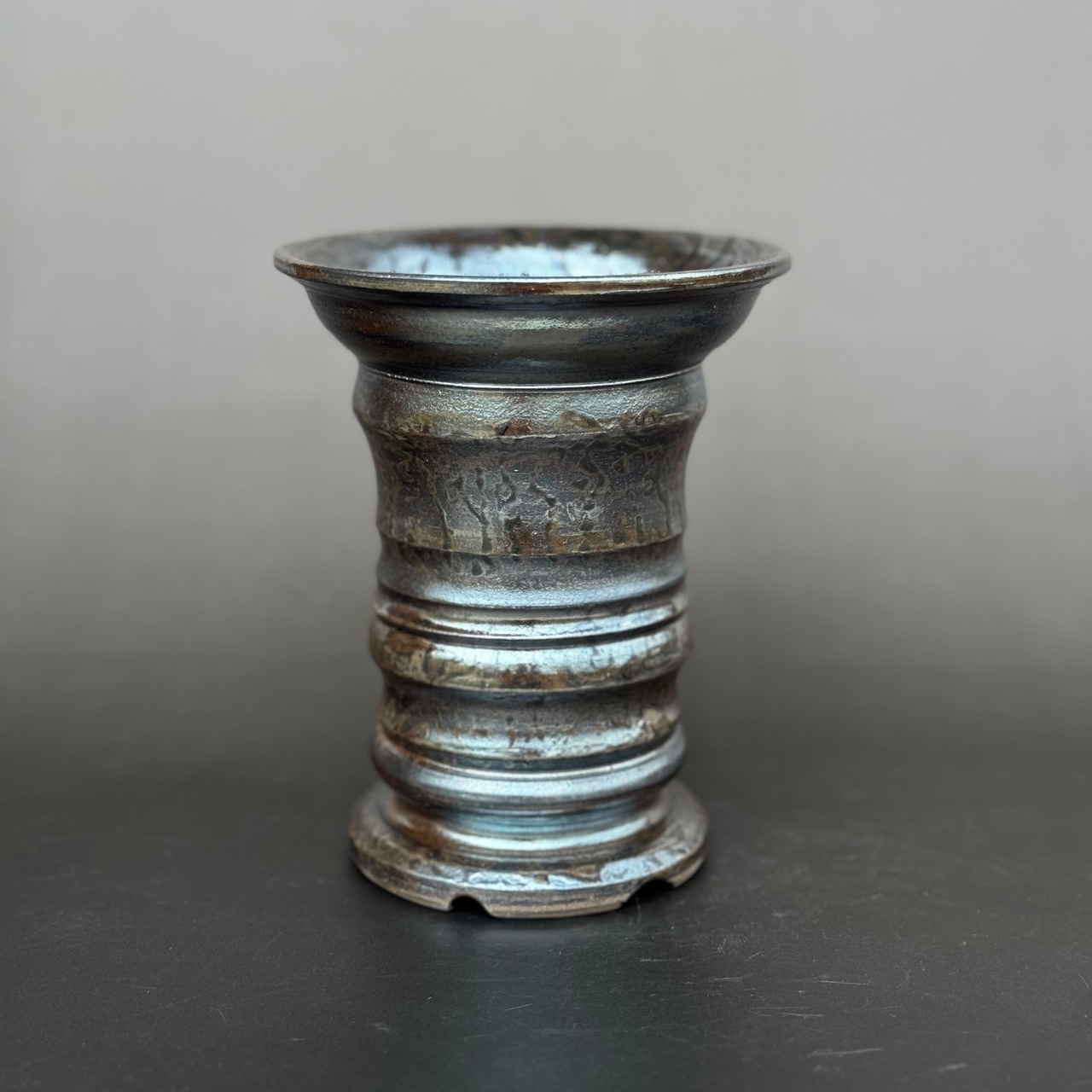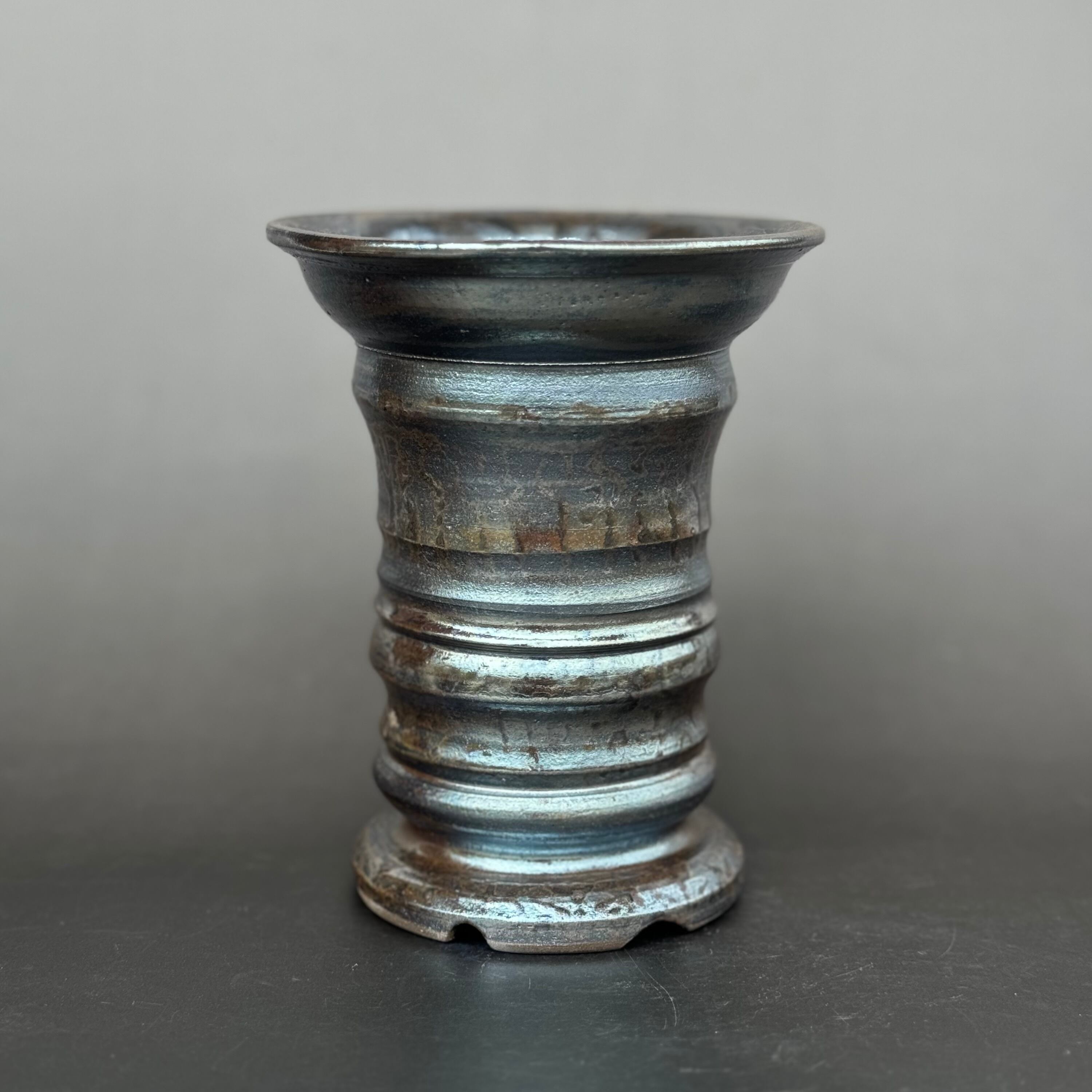 器肌全体に施された渋い光沢は、仕上げの薪による強還元焼成で得られるラスター系の金属光沢です。窯の中の置く位置で微妙に黒銀、黒金光沢などの発色が異なる特徴があります。