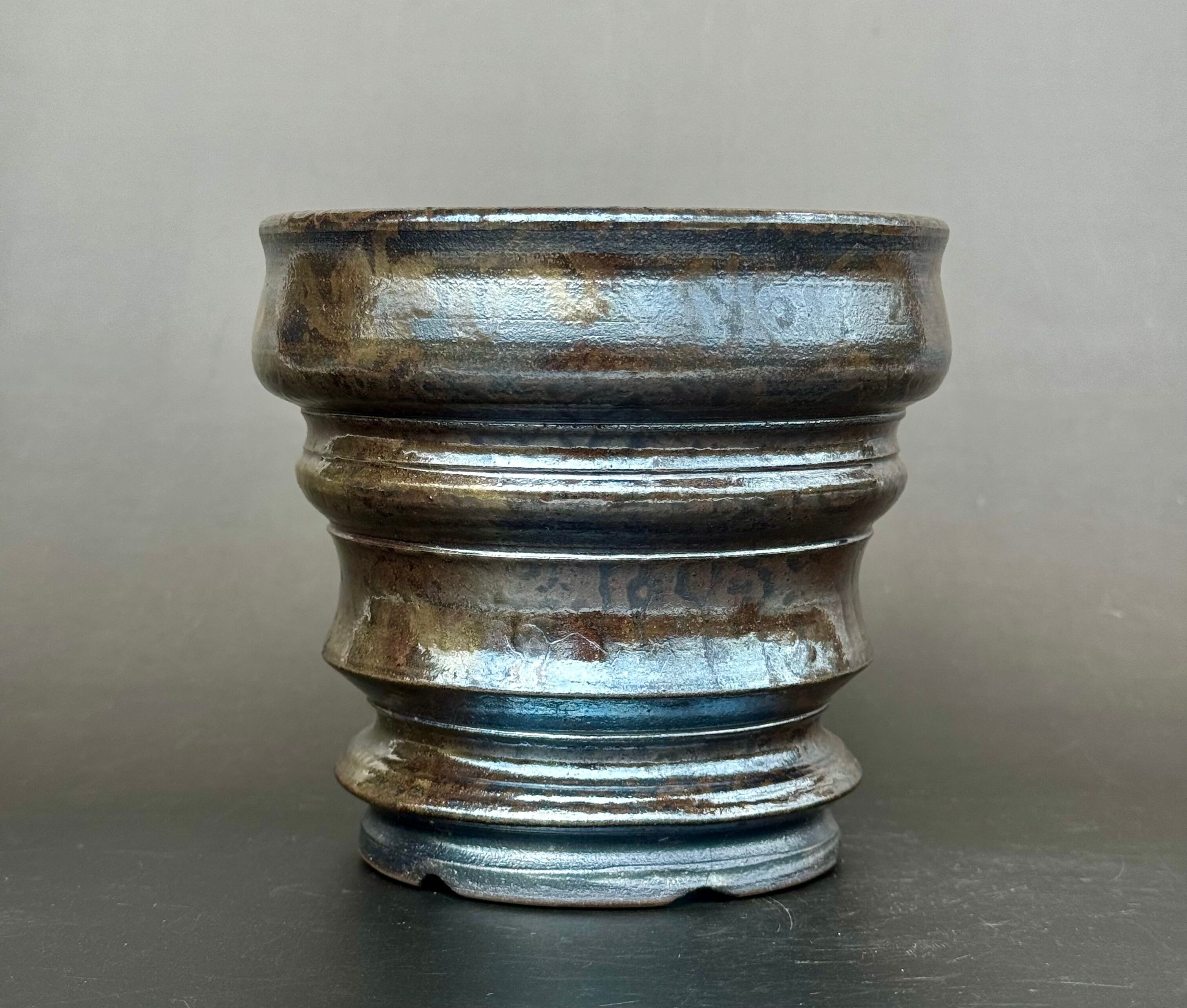 器肌全体に施された渋い光沢は、仕上げの薪による強還元焼成で得られるラスター系の金属光沢です。窯の中の置く位置で微妙に黒銀、黒金光沢などの発色が異なる特徴があります。今回の窯では黒銀から黒金へのグラデーションが綺麗にでています。