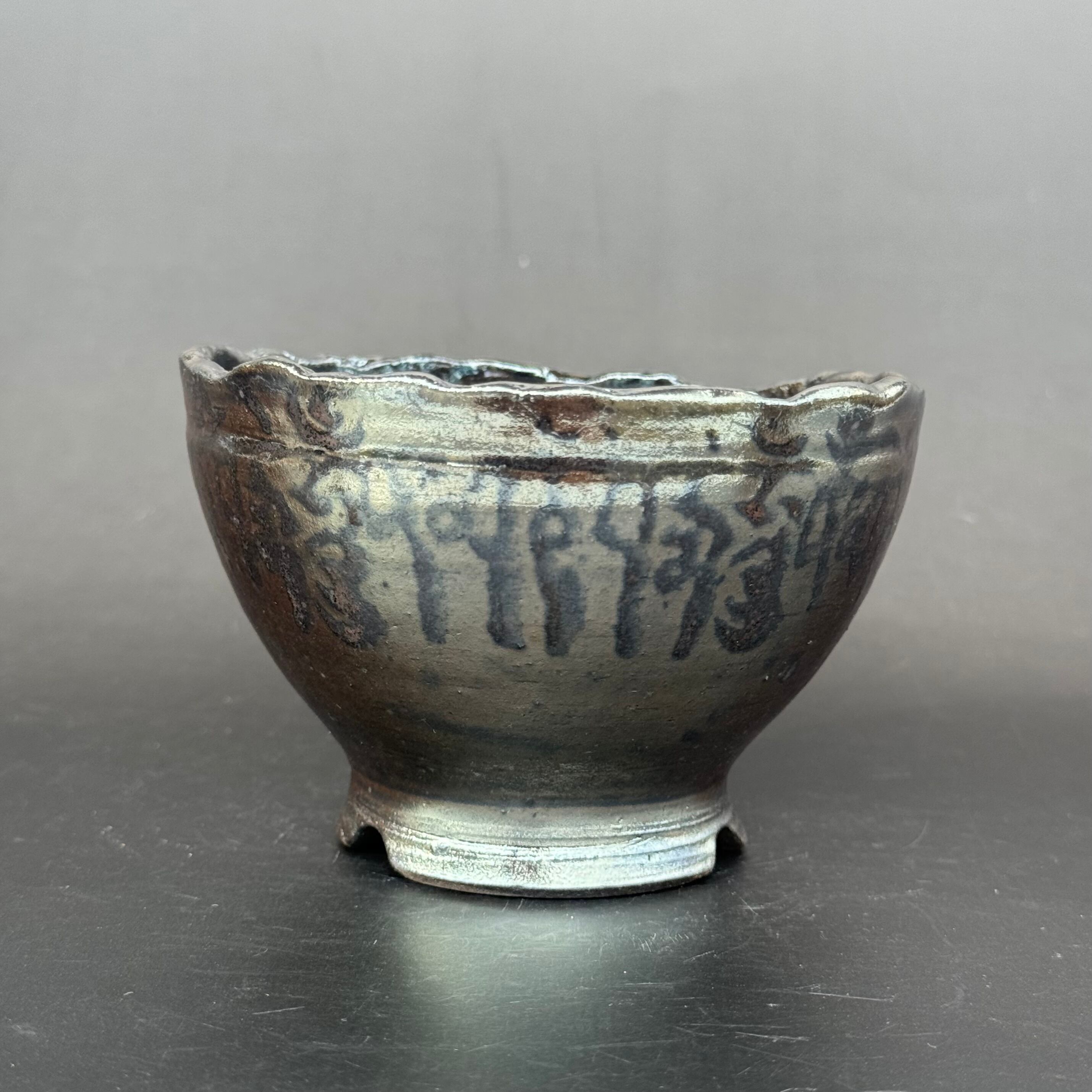 器肌全体に施された渋い光沢は、仕上げの薪による強還元焼成で得られるラスター系の金属光沢です。窯の中の置く位置で微妙に黒銀、黒金光沢などの発色が異なる特徴があります。