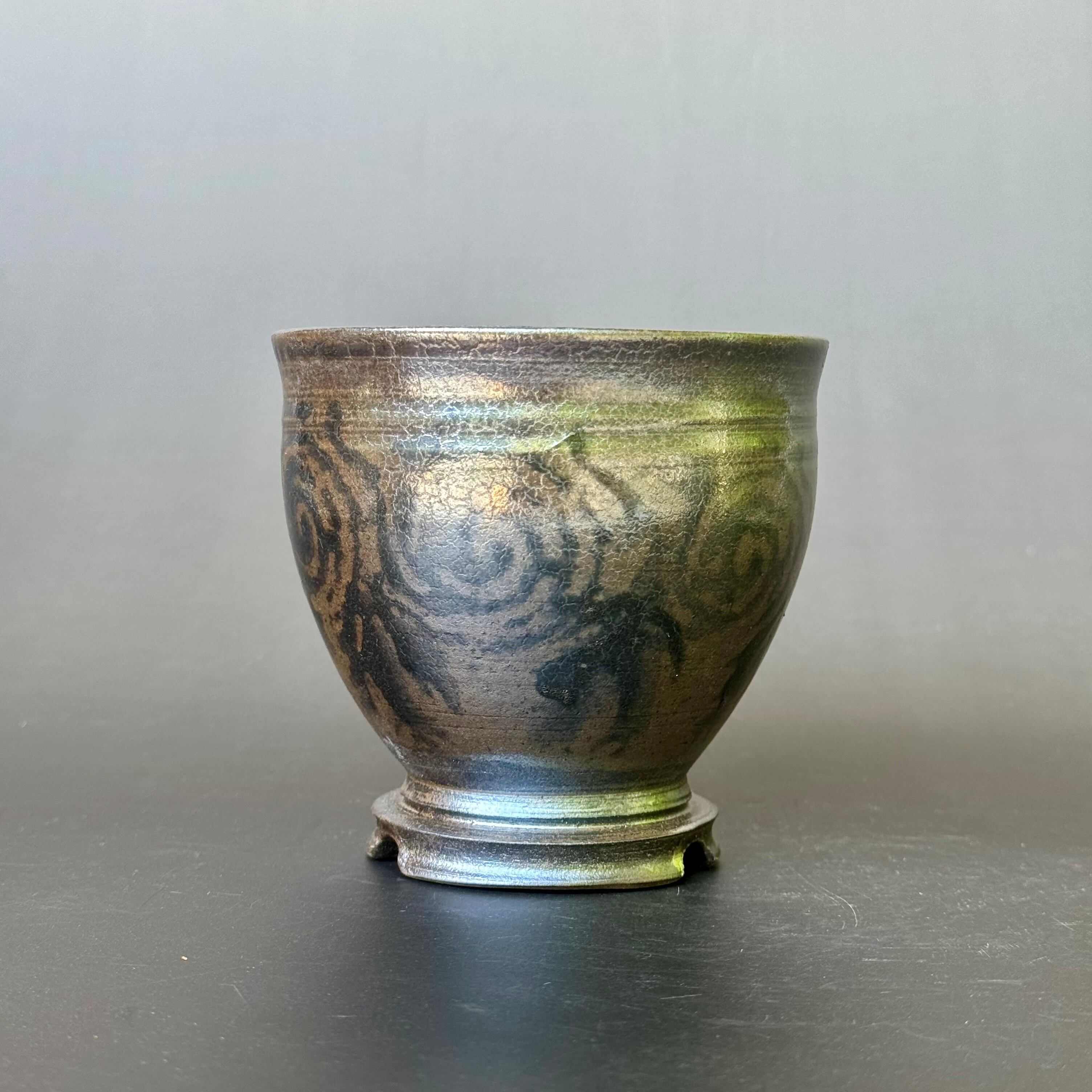 器肌全体に施された渋い光沢は、仕上げの薪による強還元焼成で得られるラスター系の金属光沢です。窯の中の置く位置で微妙に黒銀、黒金光沢などの発色が異なる特徴があります。