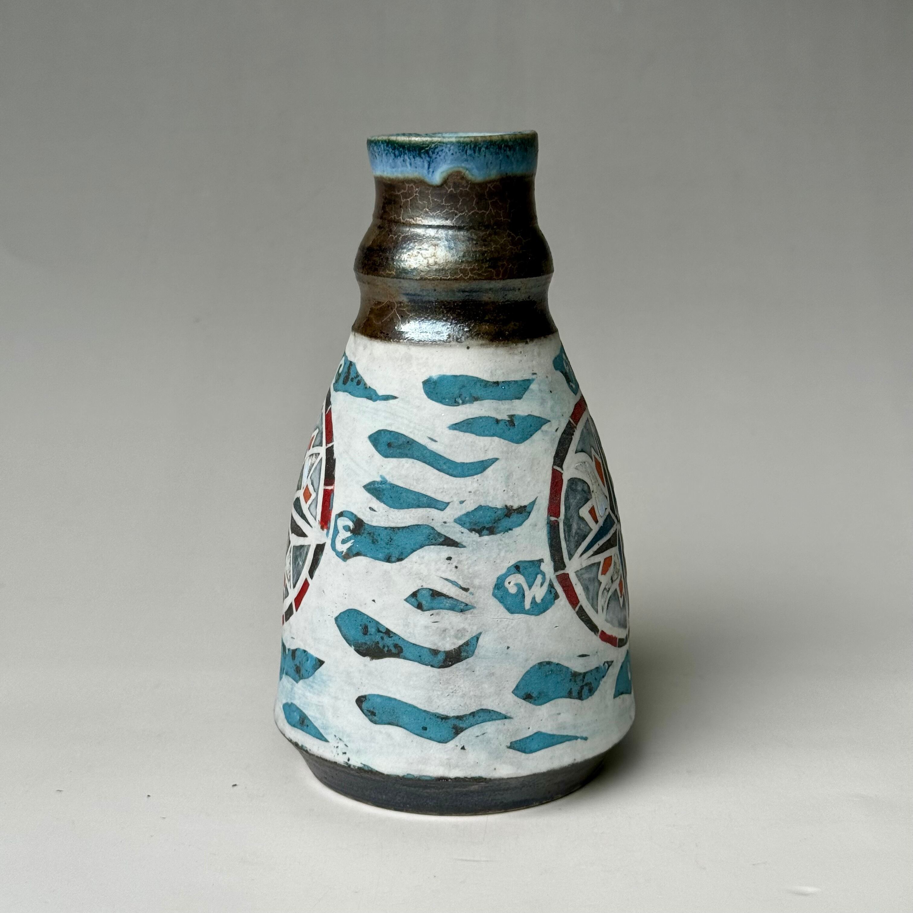 羅針盤をデザイン化し手描きで描いた酒器(徳利)です。一輪ざしとしても使えます。