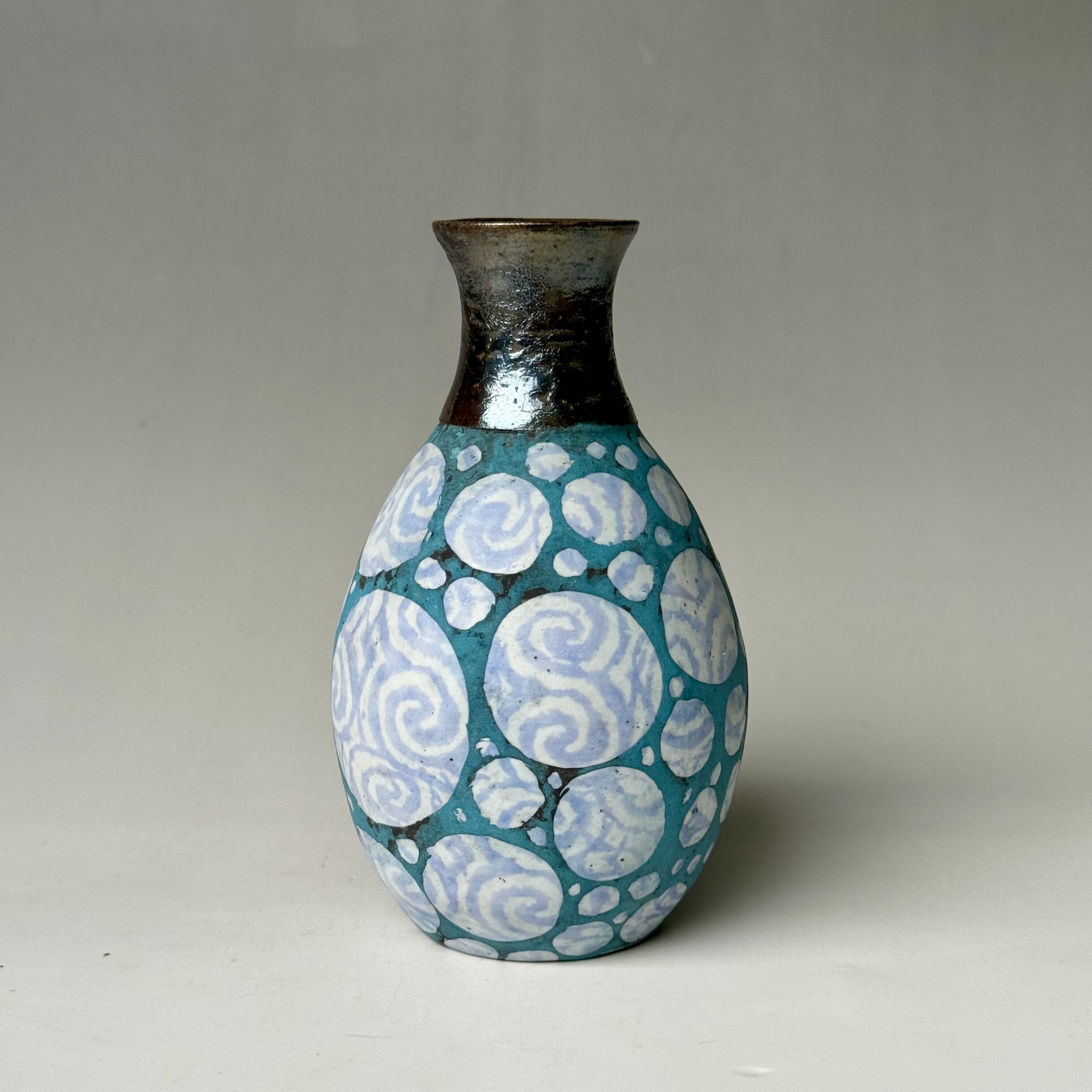 鋸歯文様(連なる三角模様)と波をデザイン化し手描きで描いた酒器(徳利)です。一輪ざしとしても使えます。