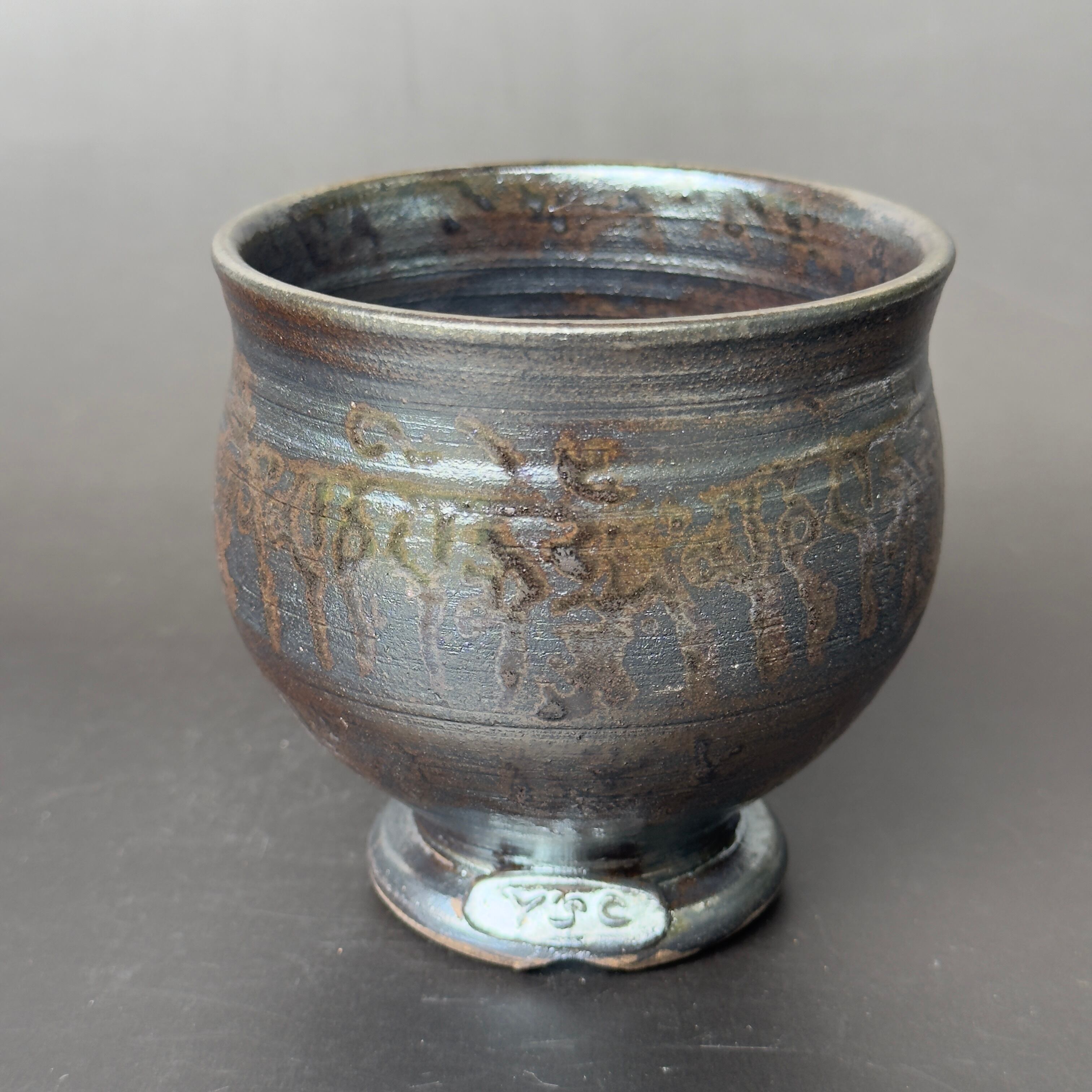 この鉢の特徴は、土が多めに入るふっくらとしたフォルムながら器底は一旦絞りソリッドに、、そこから広がる高台は、安定感があり簡単には倒れない作りです。この高台は、付け高台(後付けの高台)ではなく、削り高台(本体から削り出したもので手間は少しかかりますが、傷にならず強い作りです。)底穴は水抜けが良く、また程よい保水性があるサイズです。ワイヤー通し用の小穴も開けています。