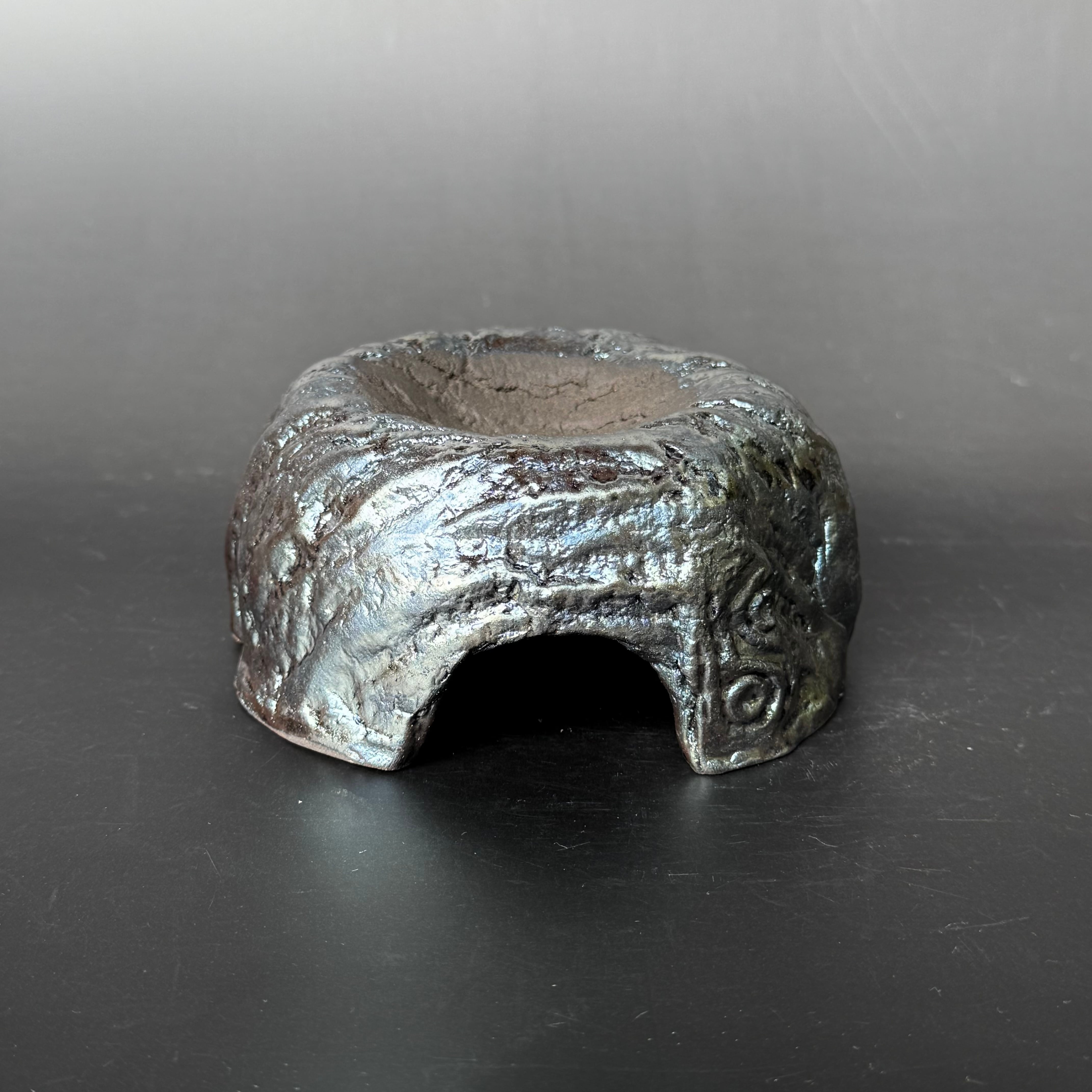 レオパードゲッコー(ヒョウモントカゲモドギ)やニシアフリカトカゲモドキ、その他トカゲ、ヤモリ、ヘビ等の爬虫類や両生類の保湿用に使えるウェットシェルターを想定し作陶しました。上部の凹部に水を入れることができます。この部分は、高温の焼き締め(釉薬無施釉)で、ゆっくりと水分が浸透しシェルター内の湿度をあげる効果があります。半日くらいかけてシェルター内部の天井が湿り始めます。水は季節にもよりますが、3日から5日ほど持ちます。また内側には釉薬(砂金釉)をかけ、乾き過ぎないように配慮しました。高温での焼成で焼きしまっているためカビなども繁殖しずらいと思います。
