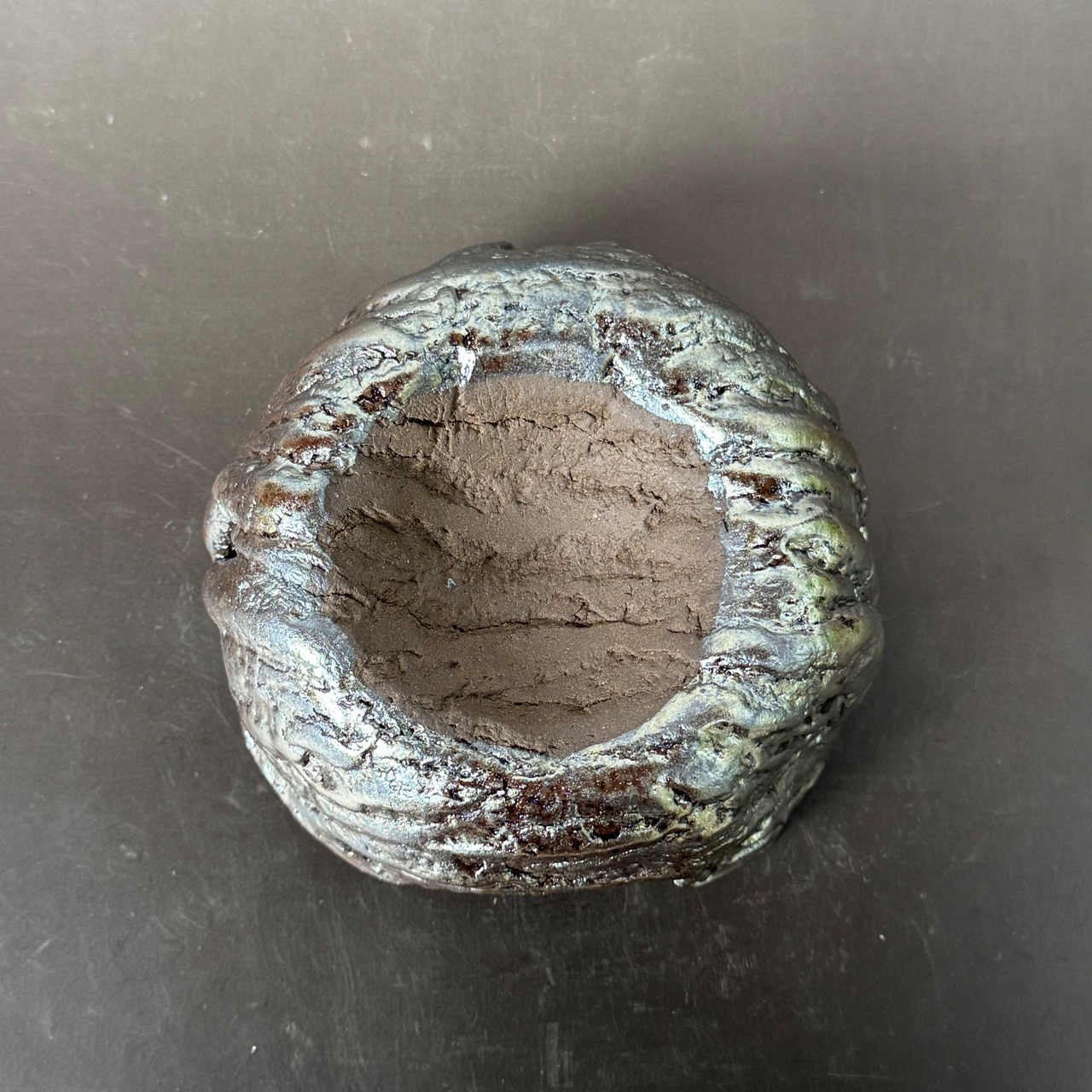 器肌全体に施された渋い光沢は、仕上げの薪による強還元焼成で得られるラスター系の金属光沢です。窯の中の置く位置で微妙に黒銀、黒金光沢などのグラデーション発色が異なる特徴があります。