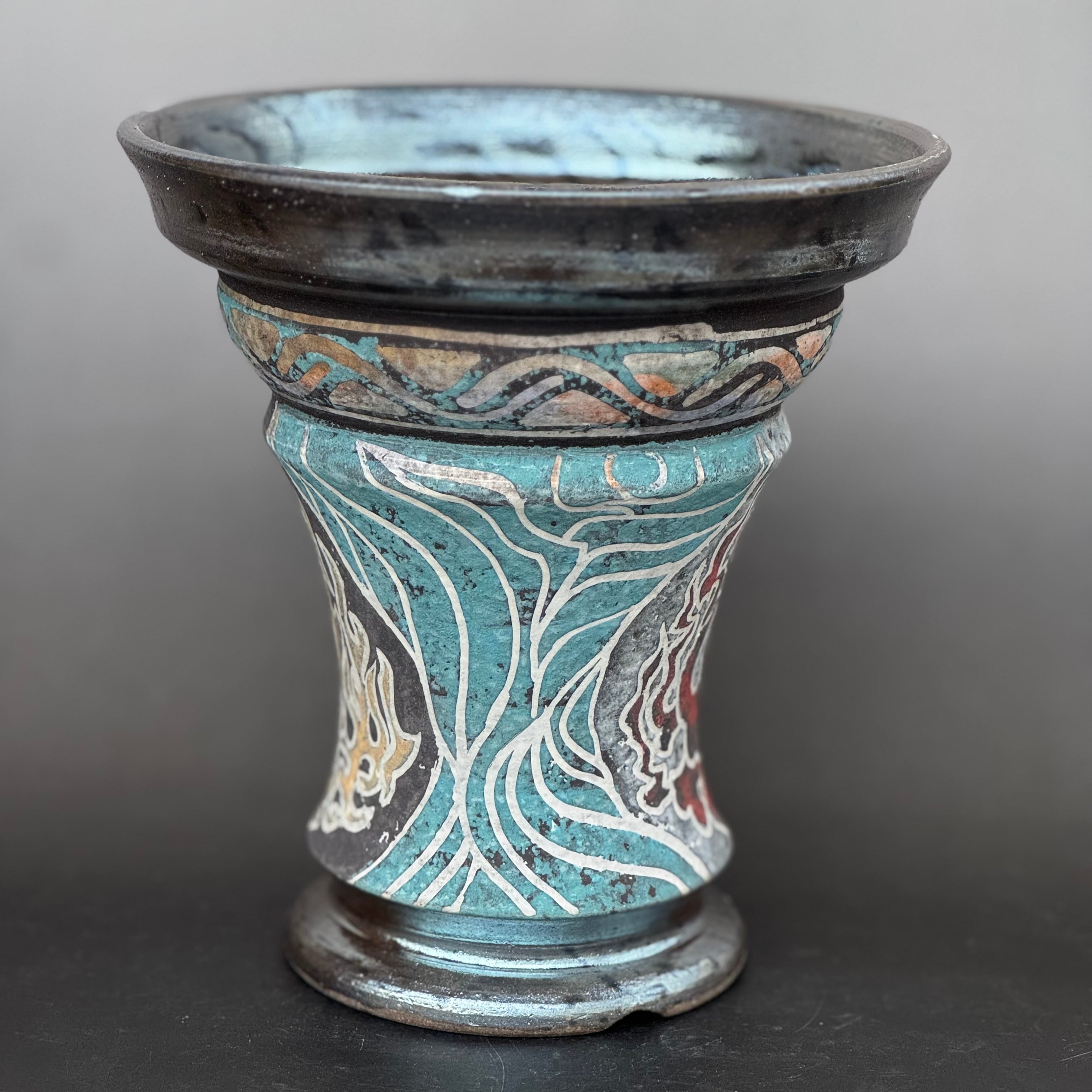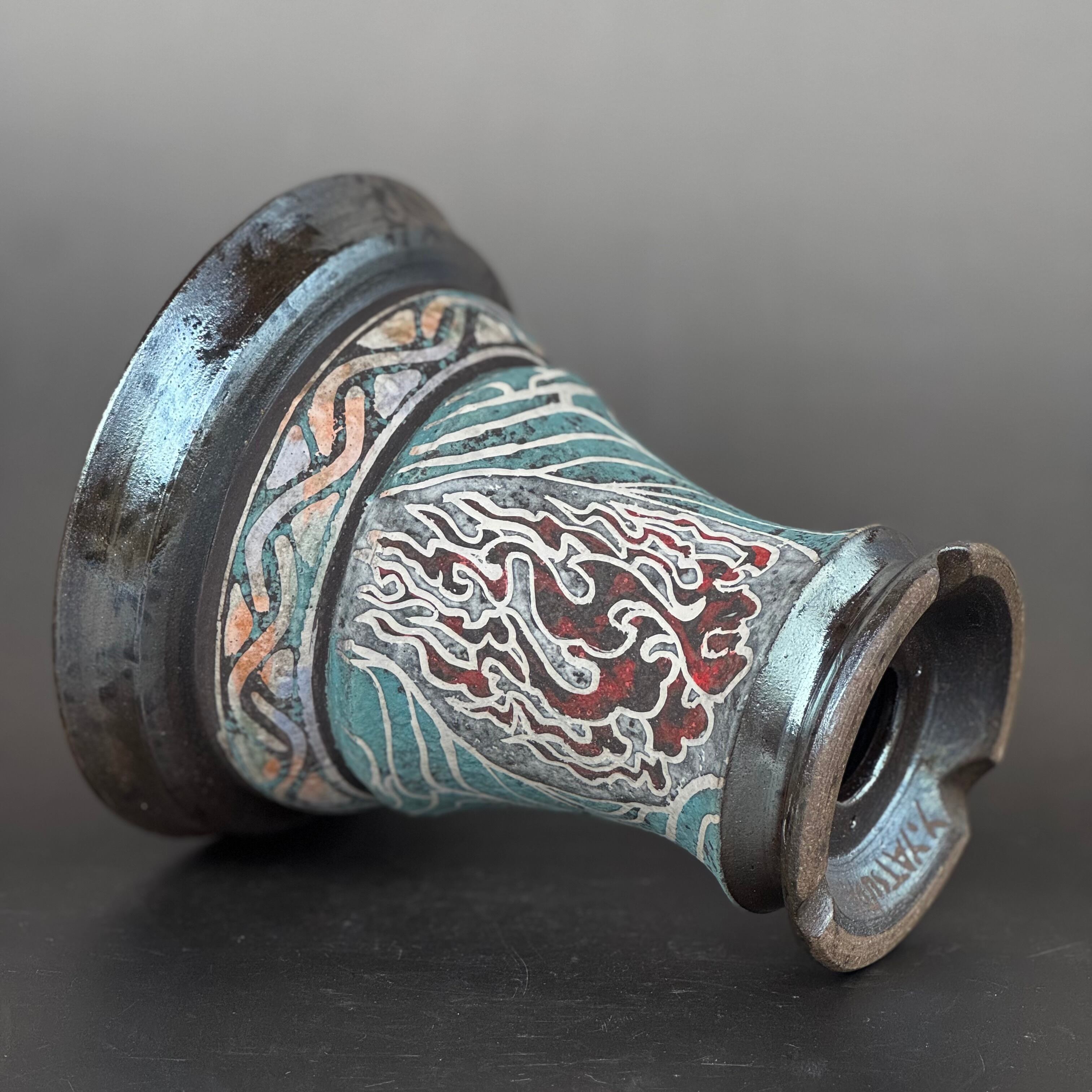 color slipによる彩色は、薪による炭彩が加わり派手でありながら渋さのある遺跡から発掘された彩色土器の風合いを帯びるよう願っています。