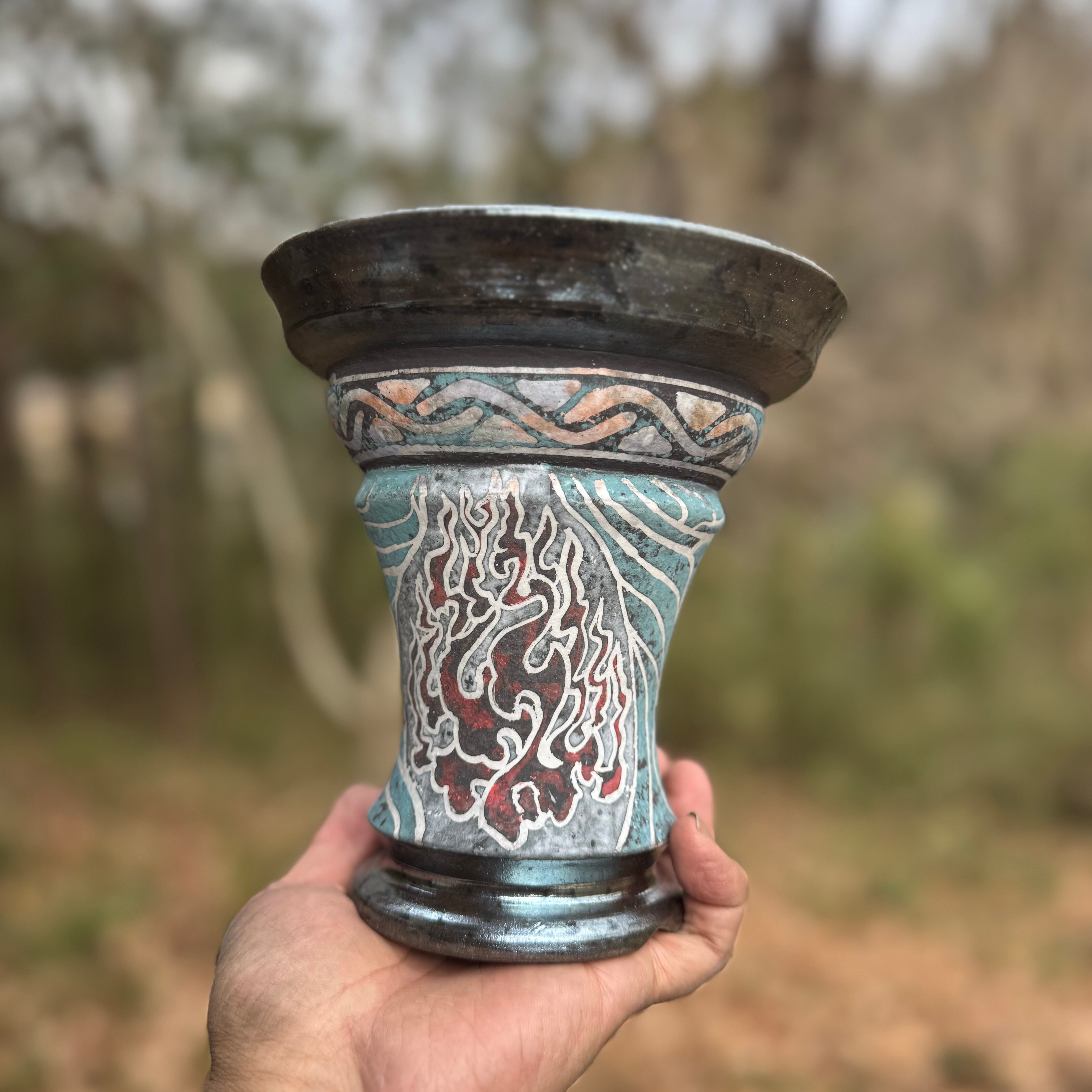 胴部分に黒炎、白炎をモチーフに模様を描いています。上部は、植物をデザイン化した模様を描きました。