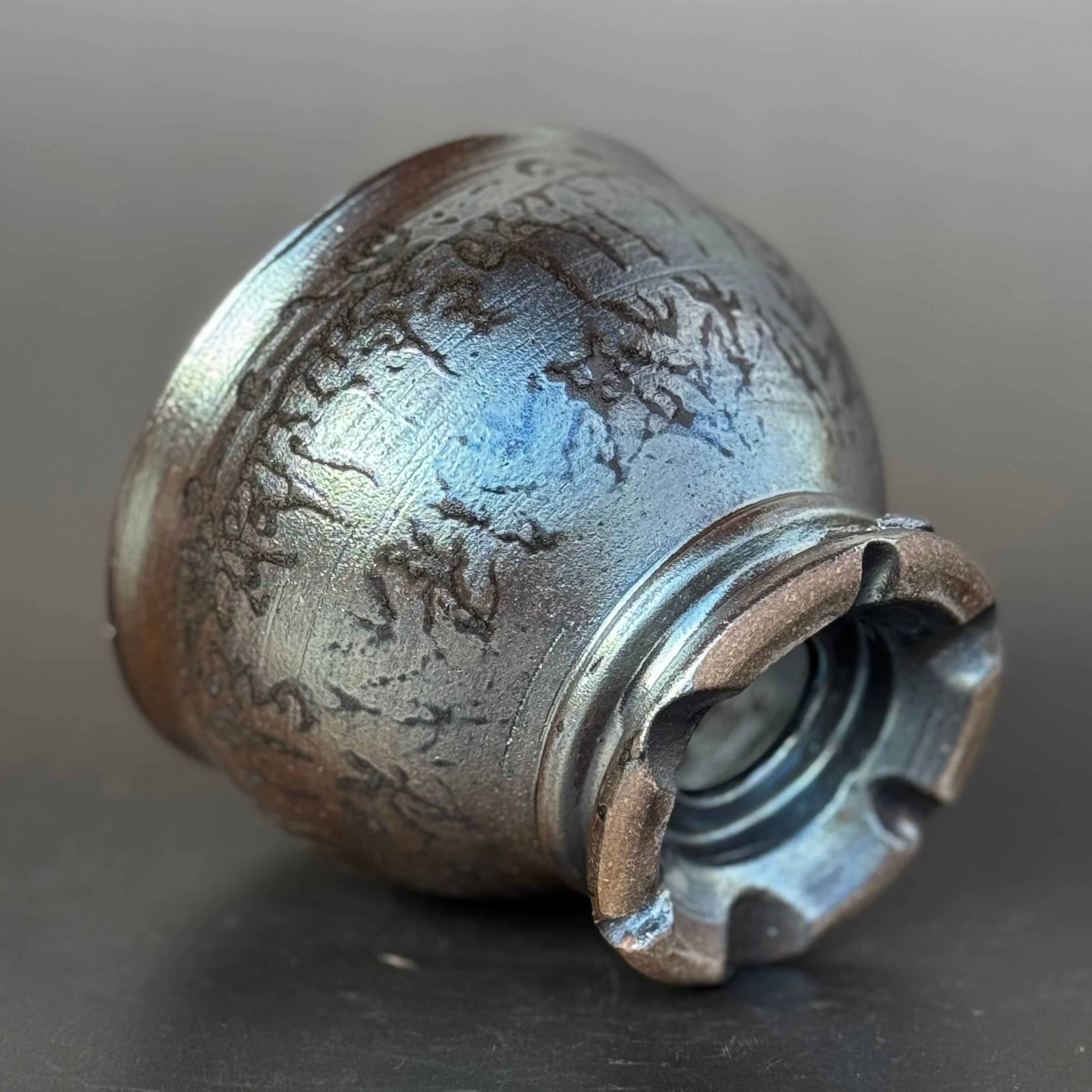 器肌全体に施された渋い光沢は、仕上げの薪による強還元焼成で得られるラスター系の金属光沢です。窯の中の置く位置で微妙に黒銀、黒金光沢などのグラデーション発色が異なる特徴があります。引き跡の線状痕をランダムに入れて器肌のテクスチャーをのっぺりではない複雑感のあるものになるように心がけて作陶しています。