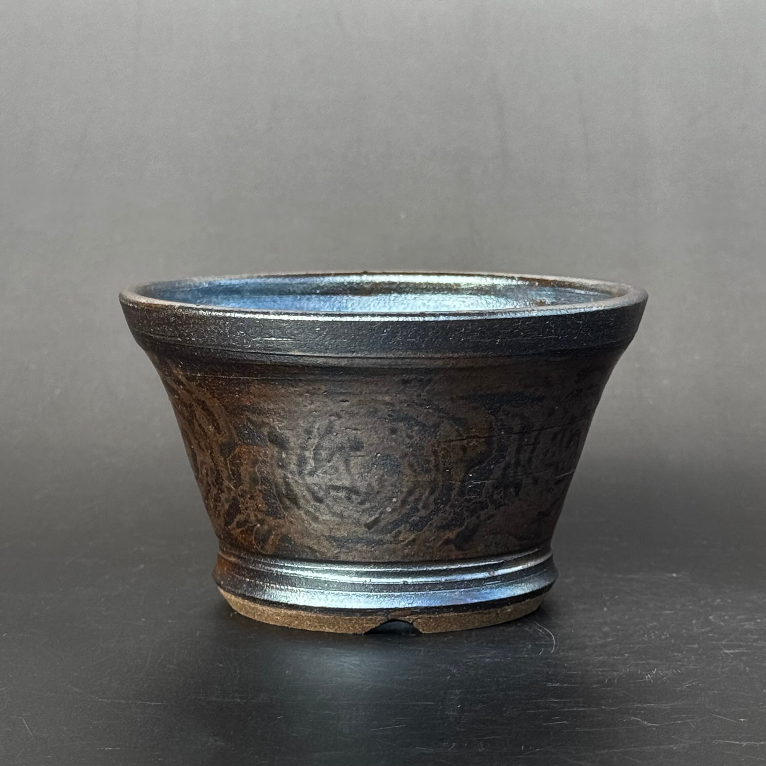 器肌全体に施された渋い光沢は、仕上げの薪による強還元焼成で得られるラスター系の金属光沢です。窯の中の置く位置で微妙に黒銀、黒金光沢などの発色が異なる特徴があります。
