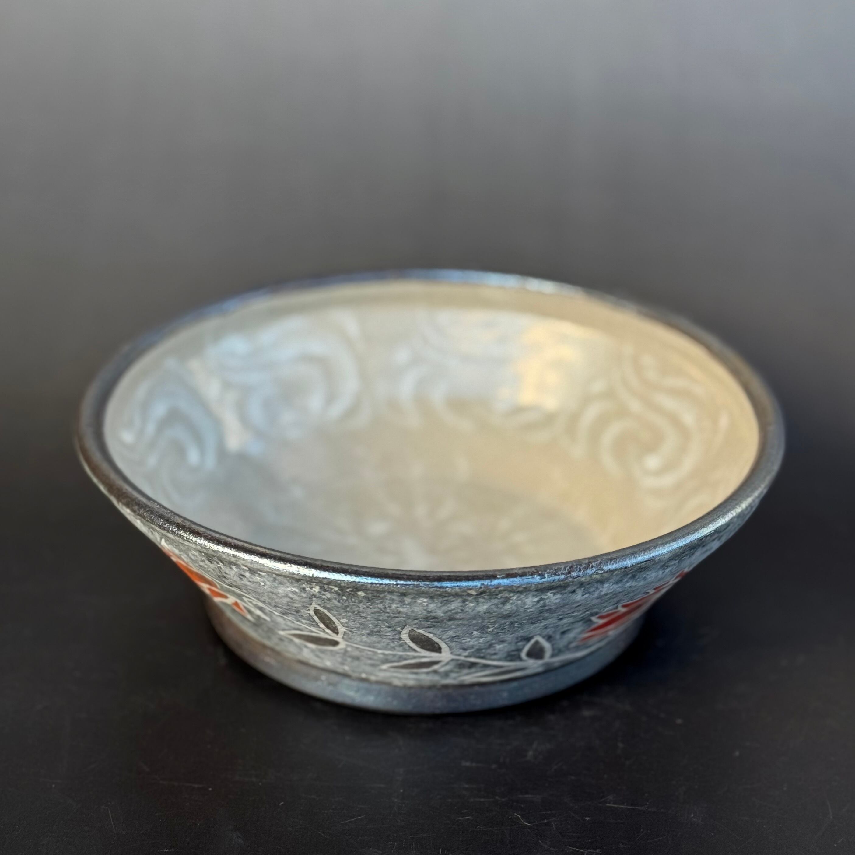 花弁や連なる葉をデザイン化した模様を器肌の外側に手描きしています。